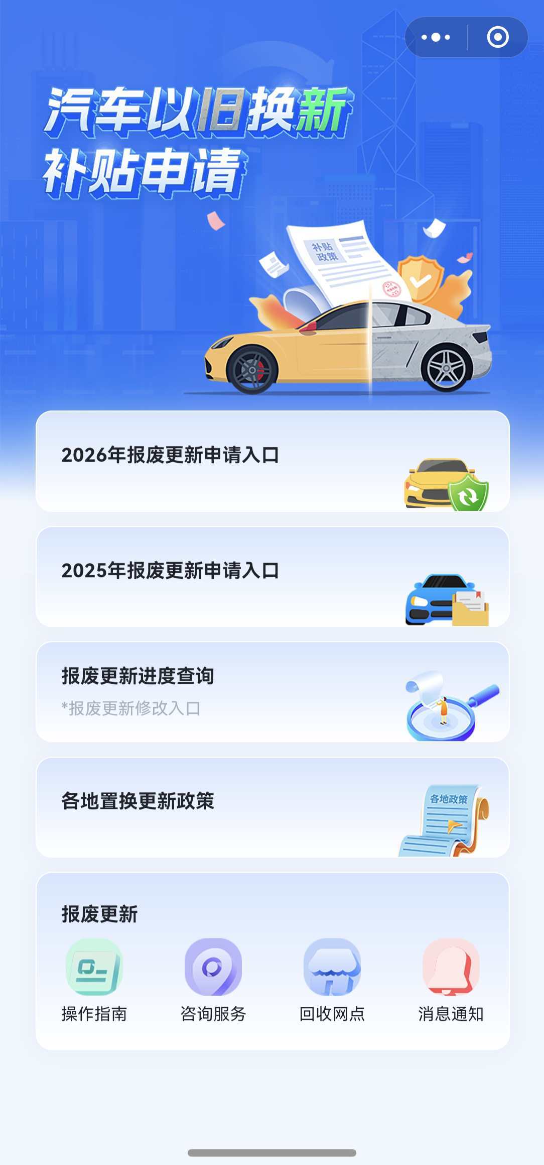 申请渠道提供线上线下双通道:手机用户可通过微信、支付宝、抖音、云闪付APP搜索“汽车以旧换新”小程序;电脑用户可登录“全国汽车流通信息管理系统”网站(https://qclt.mofcom.gov.cn )进入专题页面申请。每位消费者在2026年政策实施期间,仅能享受一次报废更新或置换更新补贴。