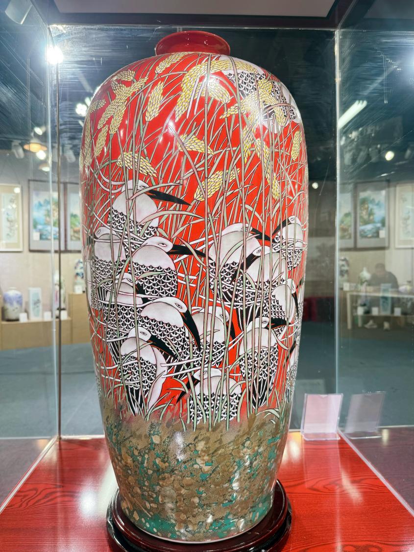 作为白金汉宫收藏的仅有的两件中国当代陶瓷作品之一,《岁岁和合》承载着深厚的文化底蕴与艺术价值。作品以标志性“宁钢红”为底色,金黄稻穗交织亭亭荷花,仙鹤悠然栖息其间,稻穗寓意“岁岁”,荷花与仙鹤象征“和合”,巧妙融合成“岁岁和合”的吉祥寓意,寄托着家庭和睦、社会和谐的美好祈愿。工艺上,作品创新融合高温色釉与传统粉彩技法,经1320度高温烧制而成,釉色温润流转,笔触细腻生动,完美诠释了宁钢“法于传统,而不囿于传统”的艺术理念。