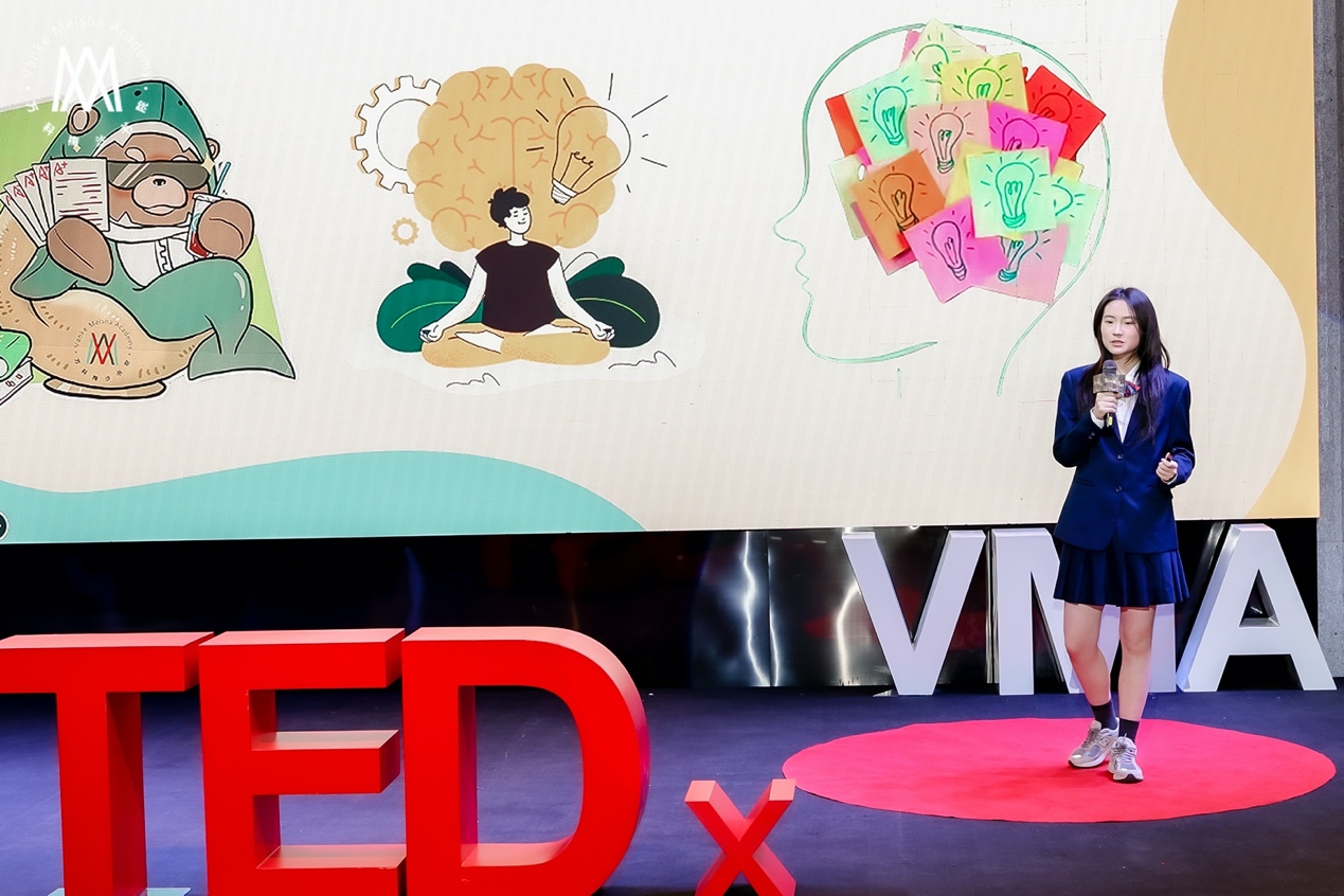 万科梅沙书院US Track Y4学生姜佳彤的演讲聚焦青少年的精神困境,却给出了温暖而实用的解决方案。她用一组组触目惊心的数据让现场安静下来:青少年抑郁、焦虑比例居高不下,注意力时长急剧缩短。“我们总在焦虑未来、分心当下,却忘了幸福就在此时此刻。”她从《小马宝莉》的故事说起,告诉大家专注当下的重要性。
