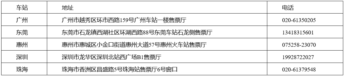 广州、东莞、惠州、深圳、珠海车站,具体地址和电话详见下表。