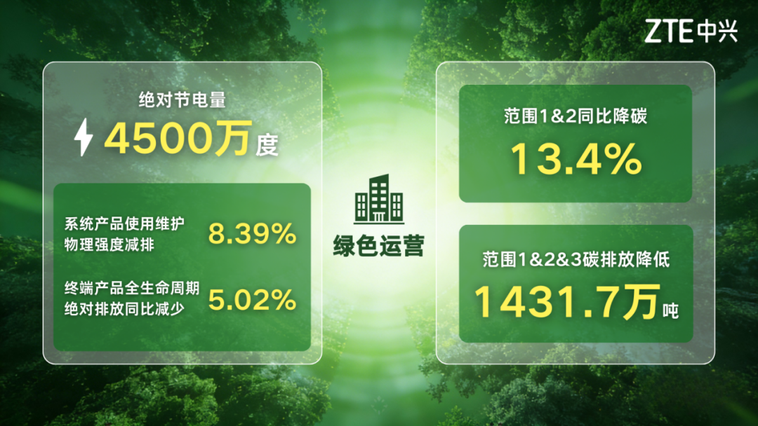 中兴通讯将绿色低碳深度融入发展战略,通过绿色企业运营、绿色供应链、绿色数字基座、绿色行业赋能四大维度铺设“数字林荫路”,助力各行各业快速步入绿色发展通道。