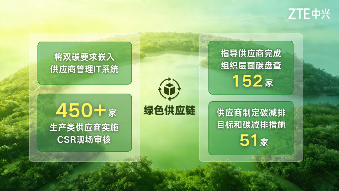在绿色供应链方面,中兴通讯将“双碳”要求嵌入供应商协议签署、现场审核、绩效考核等供应商管理IT系统,目前已对450多家生产类供应商实施了CSR现场审核,指导了152家供应商完成组织层面碳盘查,51家供应商制定碳减排目标和碳减排措施。
