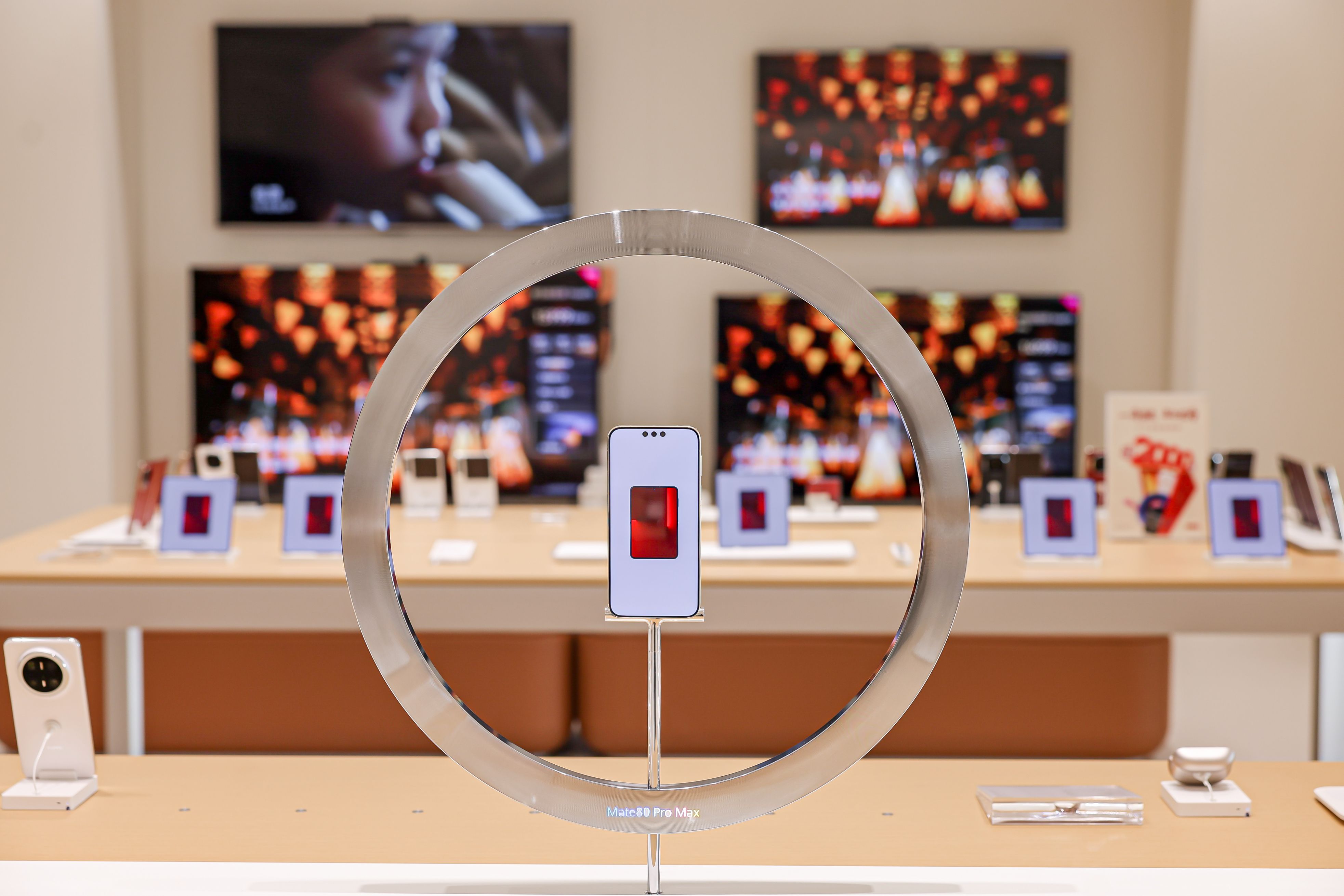 在生活馆二层展区,设有多张3C产品体验台,展示现款全场景3C产品,消费者可以在这里零距离体验华为全场景终端产品,如最新发布的手机、平板、穿戴设备、智慧屏等,感受万物互联科技为生活带来的便捷与灵感。