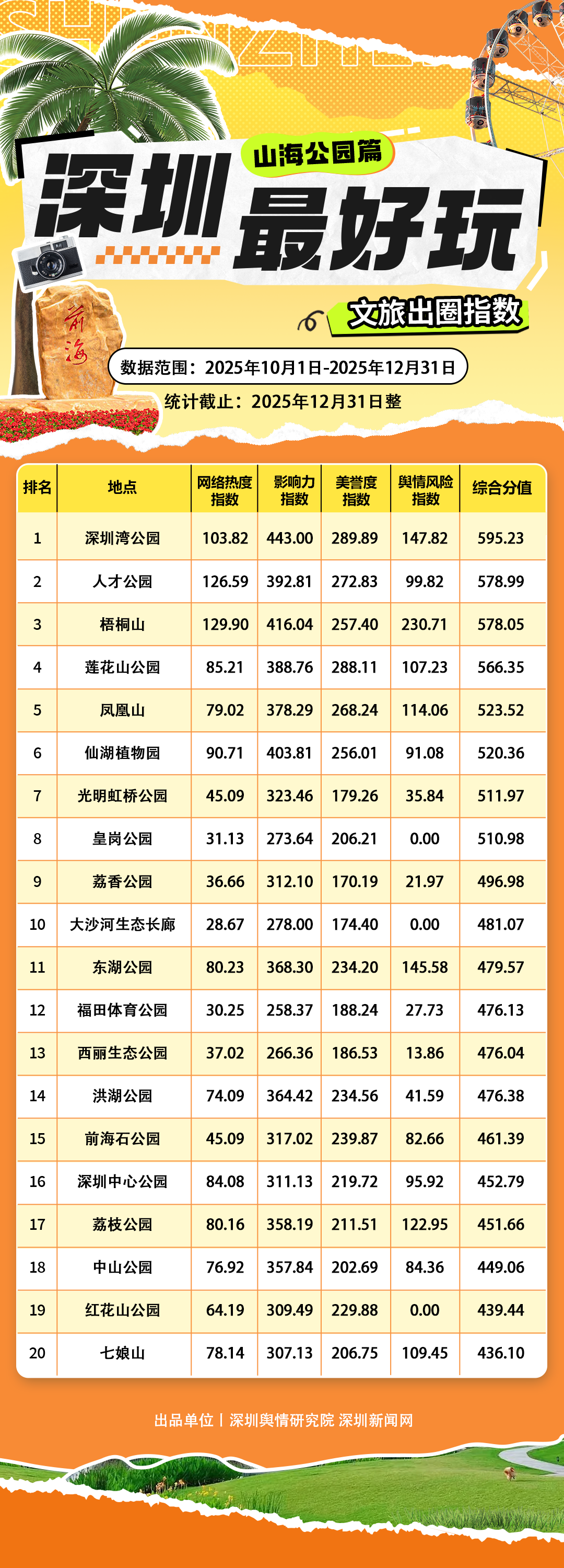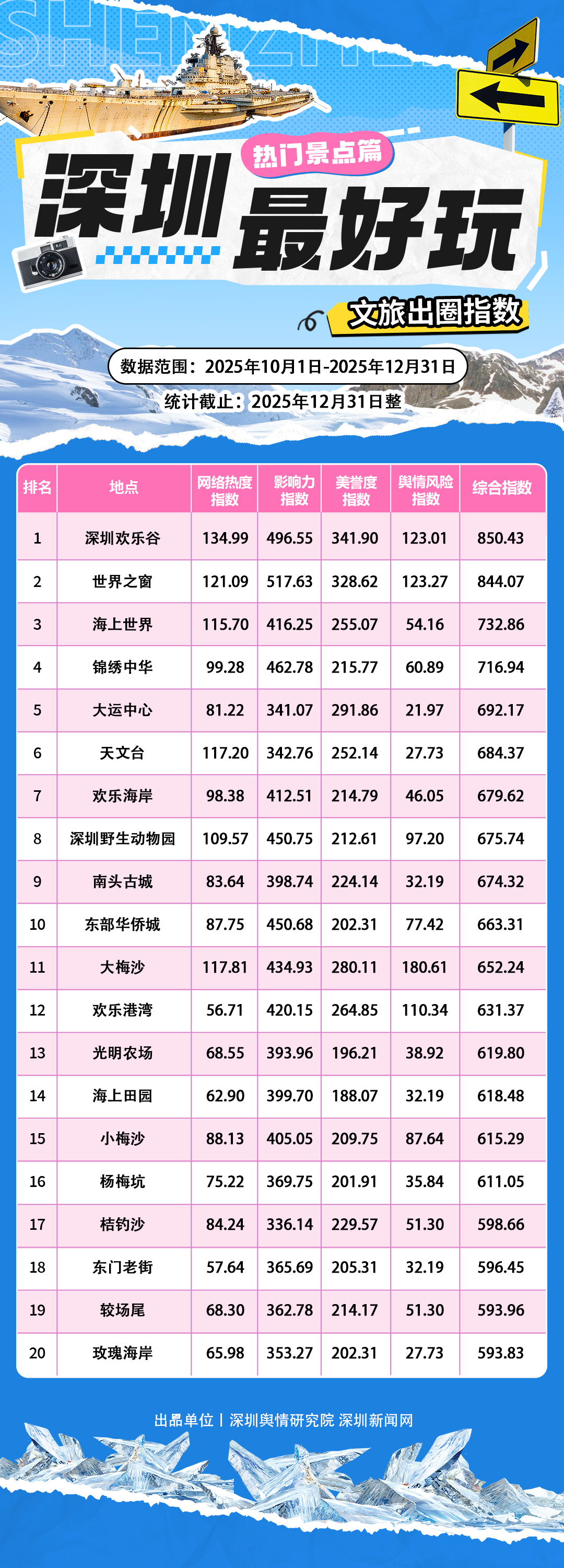 深圳新闻网2026年1月19日讯(记者 李娉婷)近日,由深圳舆情研究院联合深圳新闻网编制的2025年第四季度《“深圳最好玩”文旅出圈指数》正式对外发布。该榜单以2025年10月1日至12月31日为统计周期,覆盖深圳400余个核心文旅样本,通过构建多维度科学评价体系,综合评估各景区网络热度、影响力、美誉度及舆情风险四大核心指标,评选出各板块TOP20,为市民游客提供权威出行指引,同时为深圳文旅产业高质量发展提供数据支撑与决策参考。