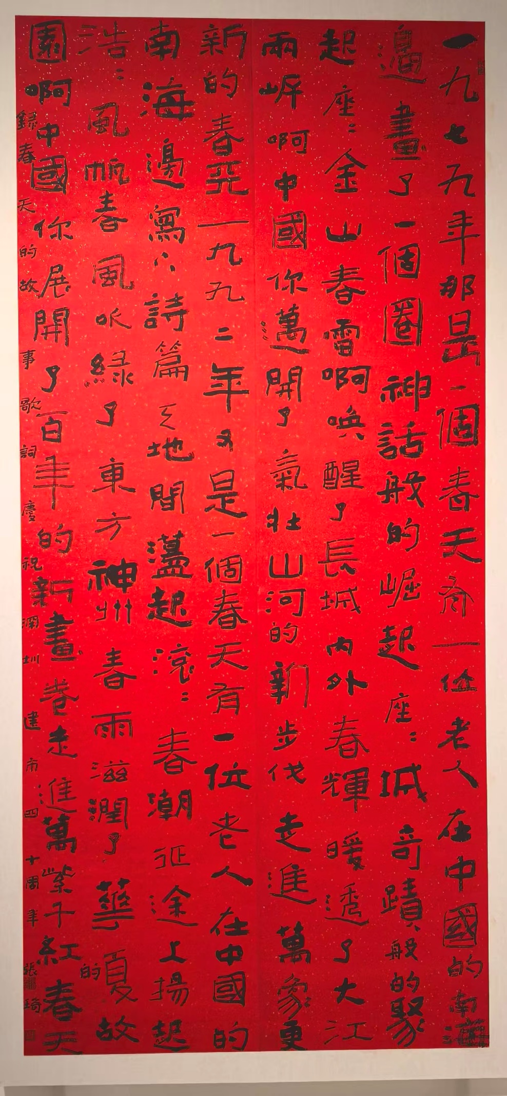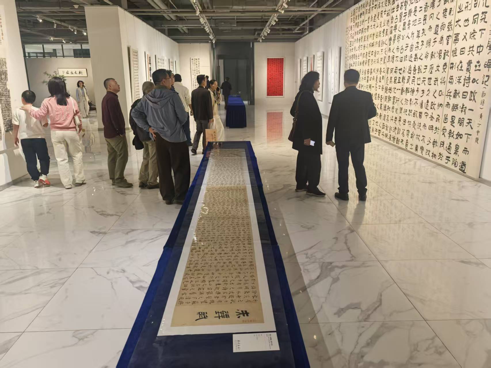 展场总面积超1200平方米,采用通透式空间设计:半透明网格挂帘将山水画作与书法长卷虚实结合,地面展台上的十米手卷《赤壁赋》与墙面的八条屏《正气歌》形成视觉对话,营造出“移步换景、层层递进”的沉浸式观展体验。