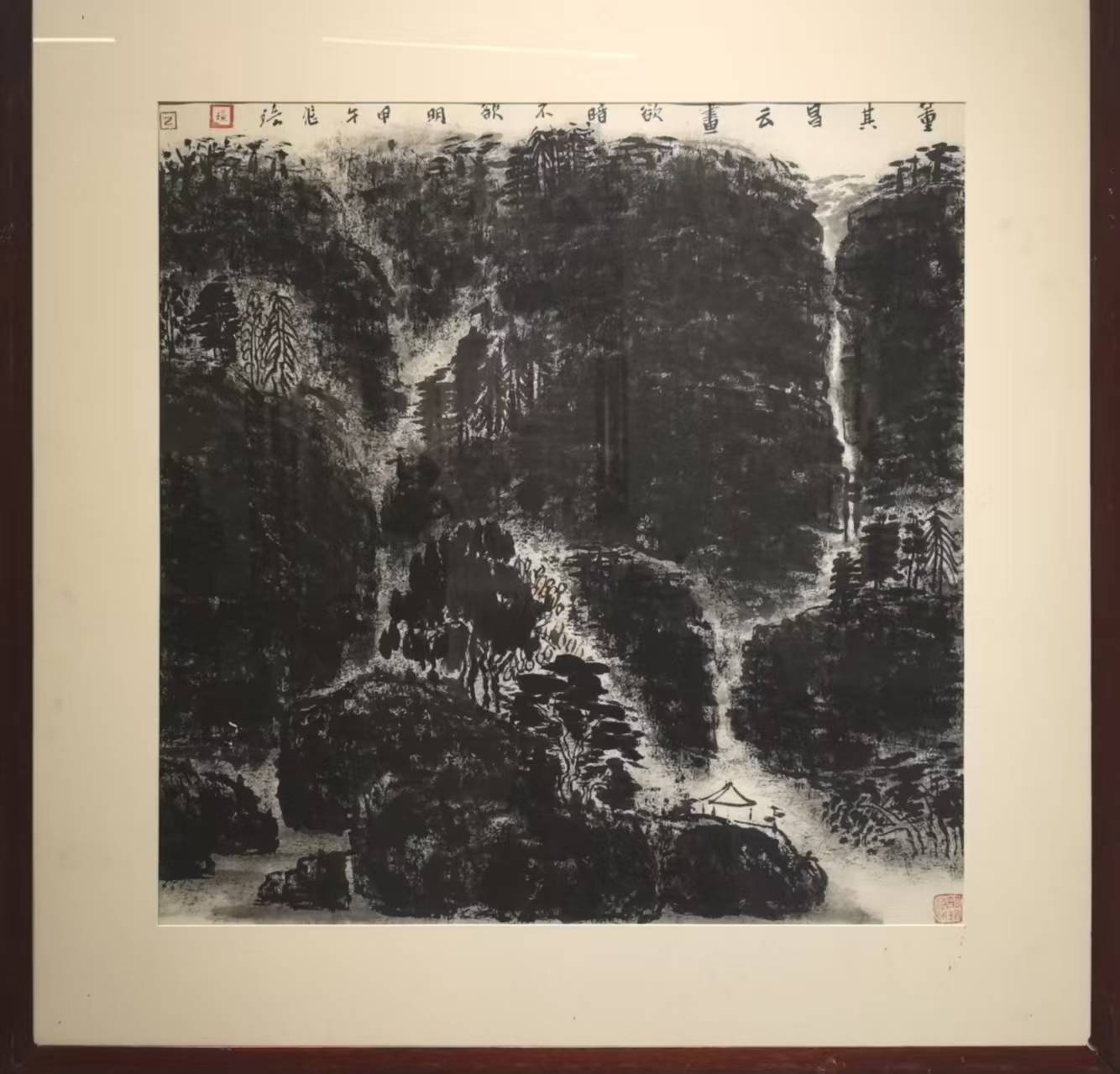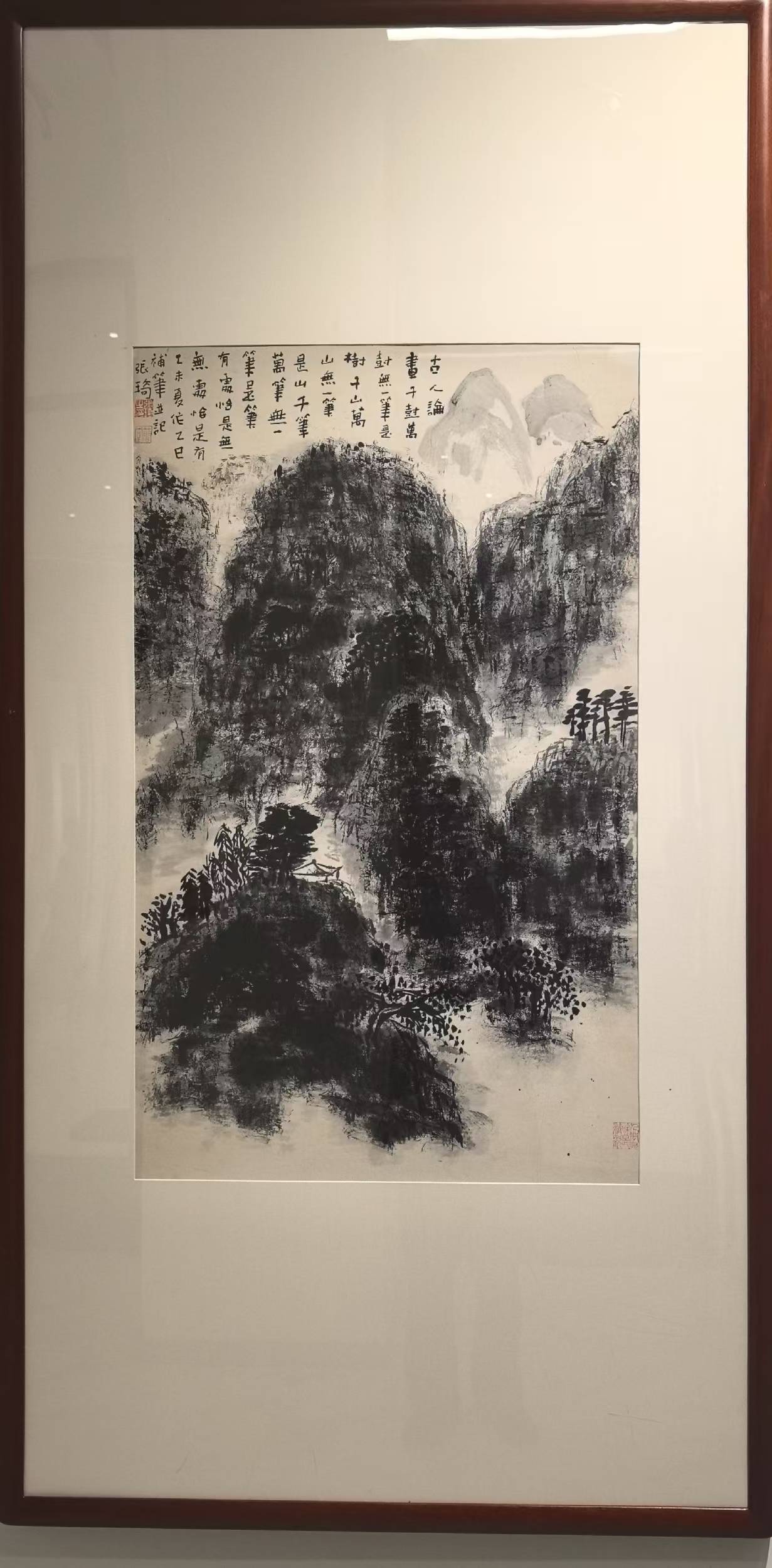 国画作品:《新安八景图手卷》以黄宾虹“浑厚华滋”的笔墨为宗,山峦层叠间留白精巧,在黑密厚重中透出岭南山水的温润灵秀;《水阁读书图》则以极简的线条勾勒文人意趣,体现“草草逸笔,自有我在”的创作追求。