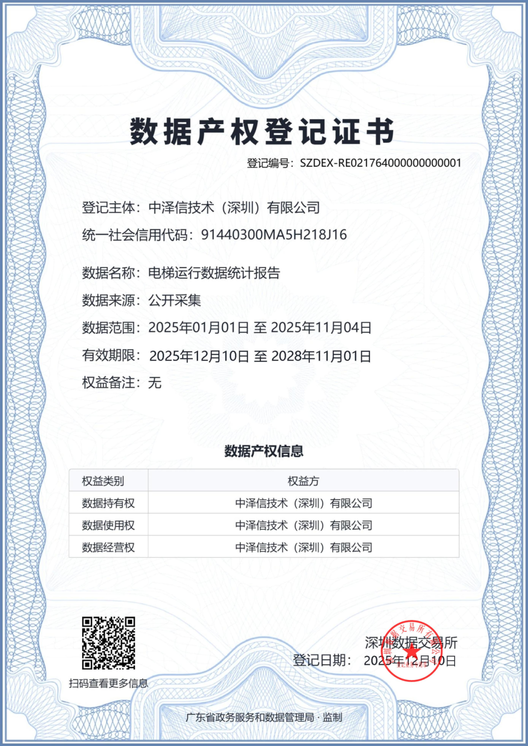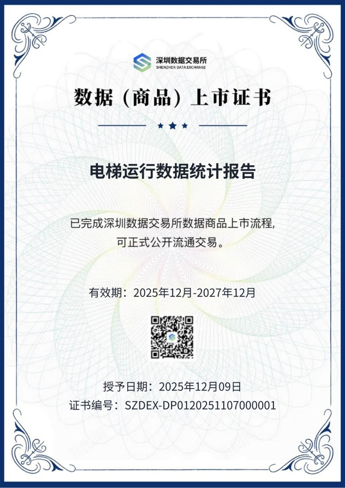 深圳新闻网2026年1月21日讯 (记者 吴猛)近日,中泽信技术(深圳)有限公司(以下简称“中泽信”)“电梯运行数据统计报告”在深圳交易集团有限公司(深圳公共资源交易中心)所属企业深圳数据交易所(以下简称“深数所”)成功挂牌上市并获得数据产权登记证书,在深数所和山东敬可成(深圳)律师事务所的助力下中泽信实现了数据资产入表计量。
