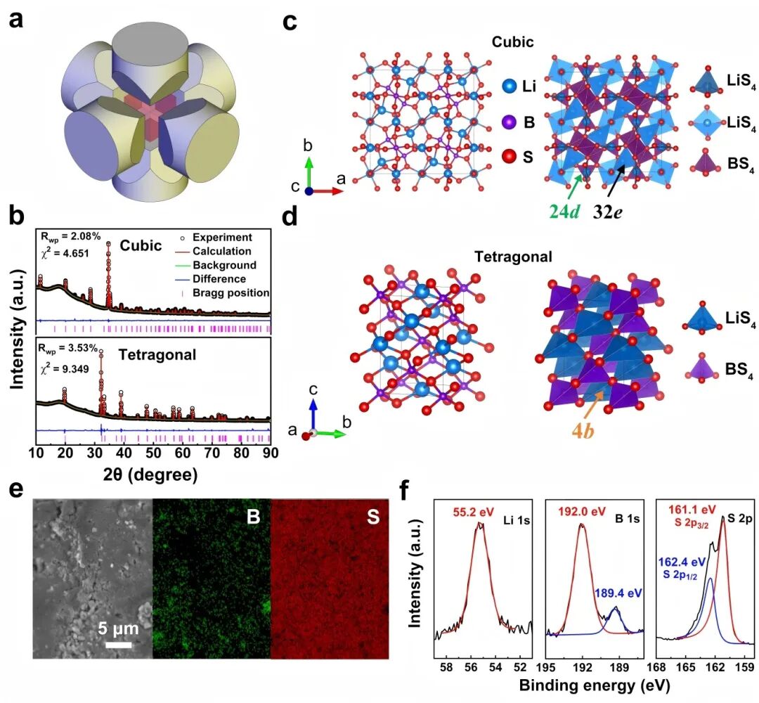 XRD和精修数据显示,通过调节反应温度,成功获得了立方相(1100 °C)和四方相(1150 °C)LiBS₂固态电解质。其中,立方相LiBS₂属于F43c空间群,其晶体结构由平面Li-S₄配位单位和极化的四面体Li-S₄配位单元共同构成,并嵌套在一个高度稳定的B-S刚性骨架之中。这一结构特征为锂离子的快速迁移提供了全新的结构模型(图1)。四方相LiBS₂属于I42d空间群,其结构由Li-S₄和B-S₄四面体组成。这种结构上的差异导致立方相和四方相LiBS₂固态电解质的室温离子电导率分别为0.43 mS cm⁻¹和9.7×10⁻³ mS cm⁻¹。