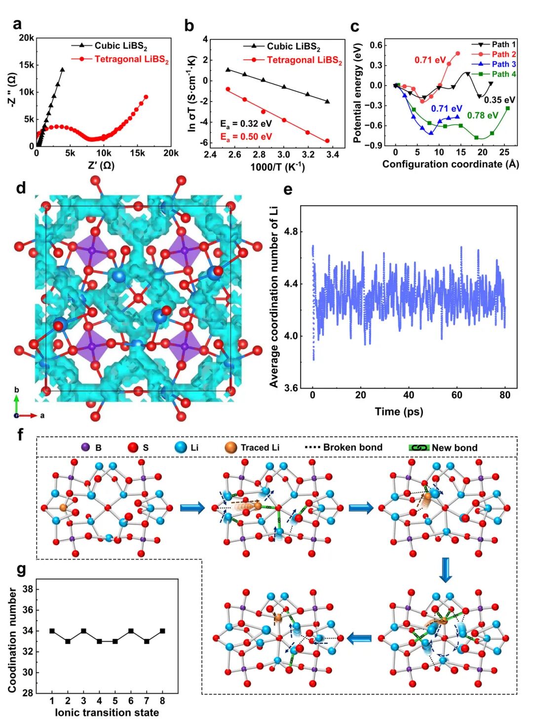 作者采用第一性原理计算中的爬坡图像弹性带方法以及从头算法分子动力学模拟,深入解析了立方相LiBS₂中锂离子的传输机制。模拟结果表明,在所有可能的迁移路径中,锂离子沿24d→24d点位之间路径迁移具有最低能垒,仅0.35 eV,是立方相LiBS₂中主导的扩散通道。更为重要的是,锂离子的迁移并非发生在静态晶格中,而是在空间和时间上均伴随着局域的“Li-S”动态配位过程。在迁移起始阶段,锂离子离开平面Li-S₄配位中心,迁移过程中,原有Li-S键发生断裂,同时新的Li-S键同步生成,这种“配位-脱配位-再配位”的动态过程,使锂离子在过渡态中仍能保持不低于4的高配位数,甚至短暂形成五配位结构,从而显著降低迁移过渡态能量。此外,迁移路径周围的锂离子并非静止不动,而是发生集体扭曲与旋转,以类似“旋转浆轮效应”的协同方式推动锂离子完成迁移(图2f)。这一机制与经典的“空位扩散模型”存在本质区别,是立方相LiBS₂实现超离子传导的关键物理根源(图2)。