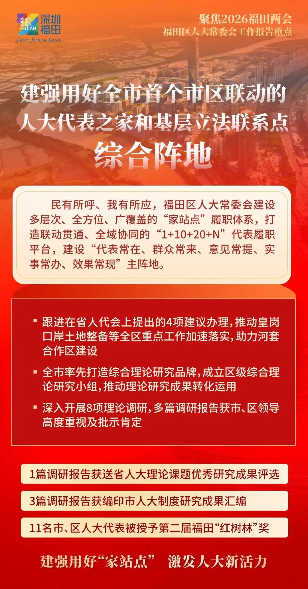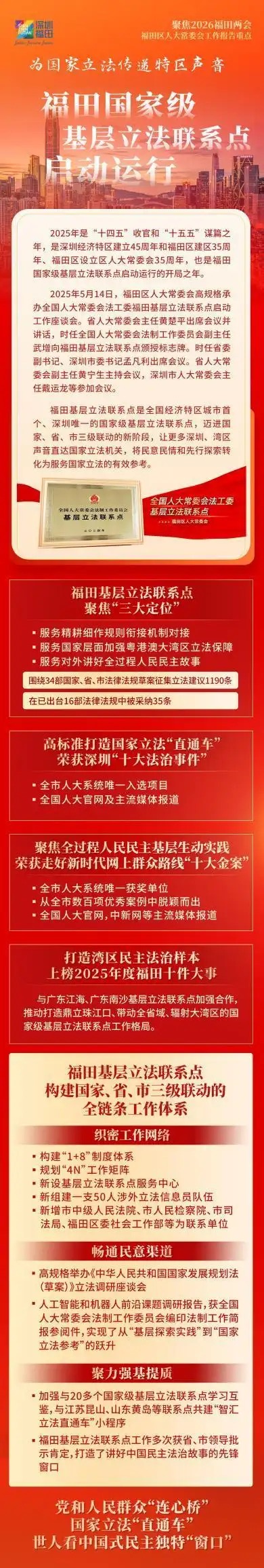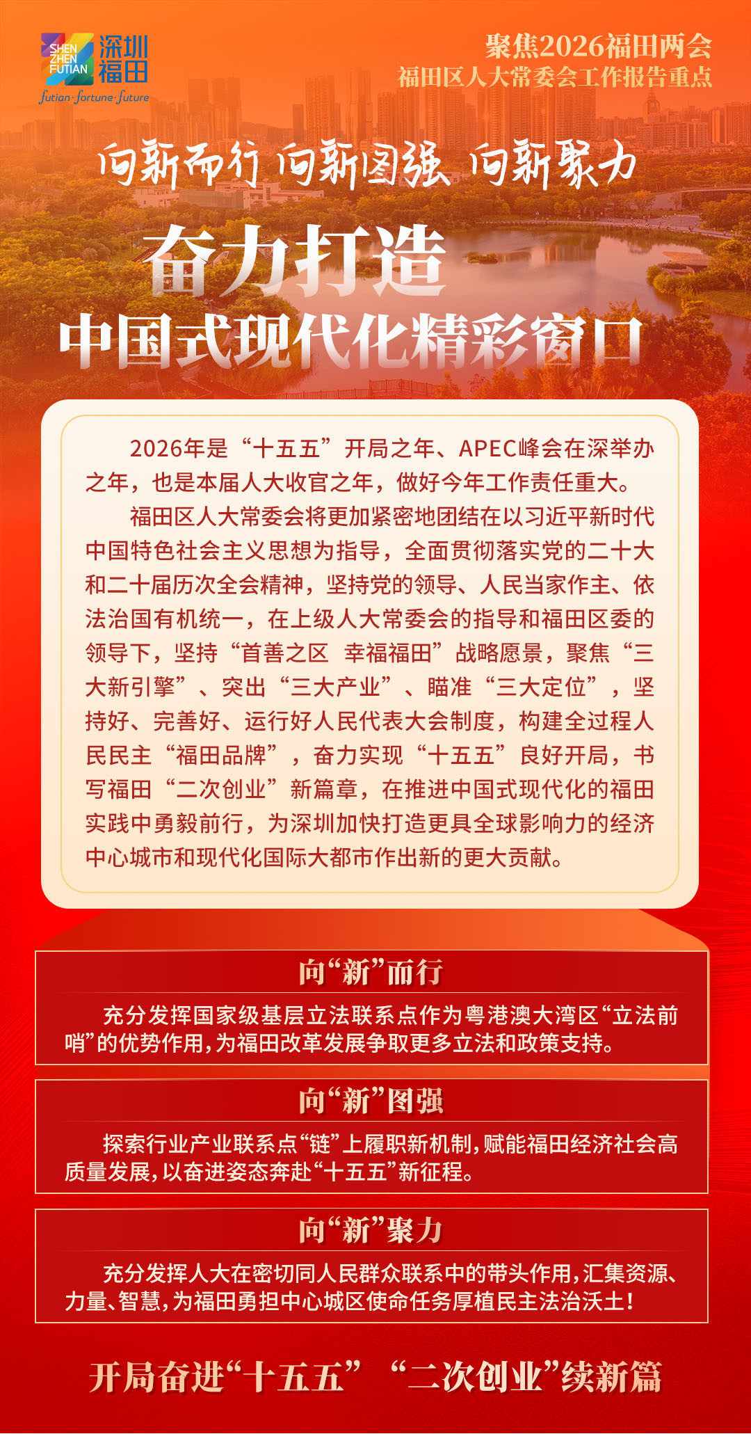 福田区人大常委会将向“新”而行,发挥国家级基层立法联系点作为粤港澳大湾区“立法前哨”的优势作用,积极向上反映民智民意,为福田改革发展争取更多立法和政策支持;向“新”图强,探索行业产业联系点“链”上履职新机制,赋能福田经济社会高质量发展,以奋进姿态走好“十五五”新征程;向“新”聚力,充分发挥人大在密切同人民群众联系中的带头作用,汇集一切资源、力量、智慧,为福田勇担中心城区使命任务厚植民主法治沃土,奋力实现“十五五”良好开局,书写福田“二次创业”新篇章,为深圳加快打造更具全球影响力的经济中心城市和现代化国际大都市作出新的更大贡献。