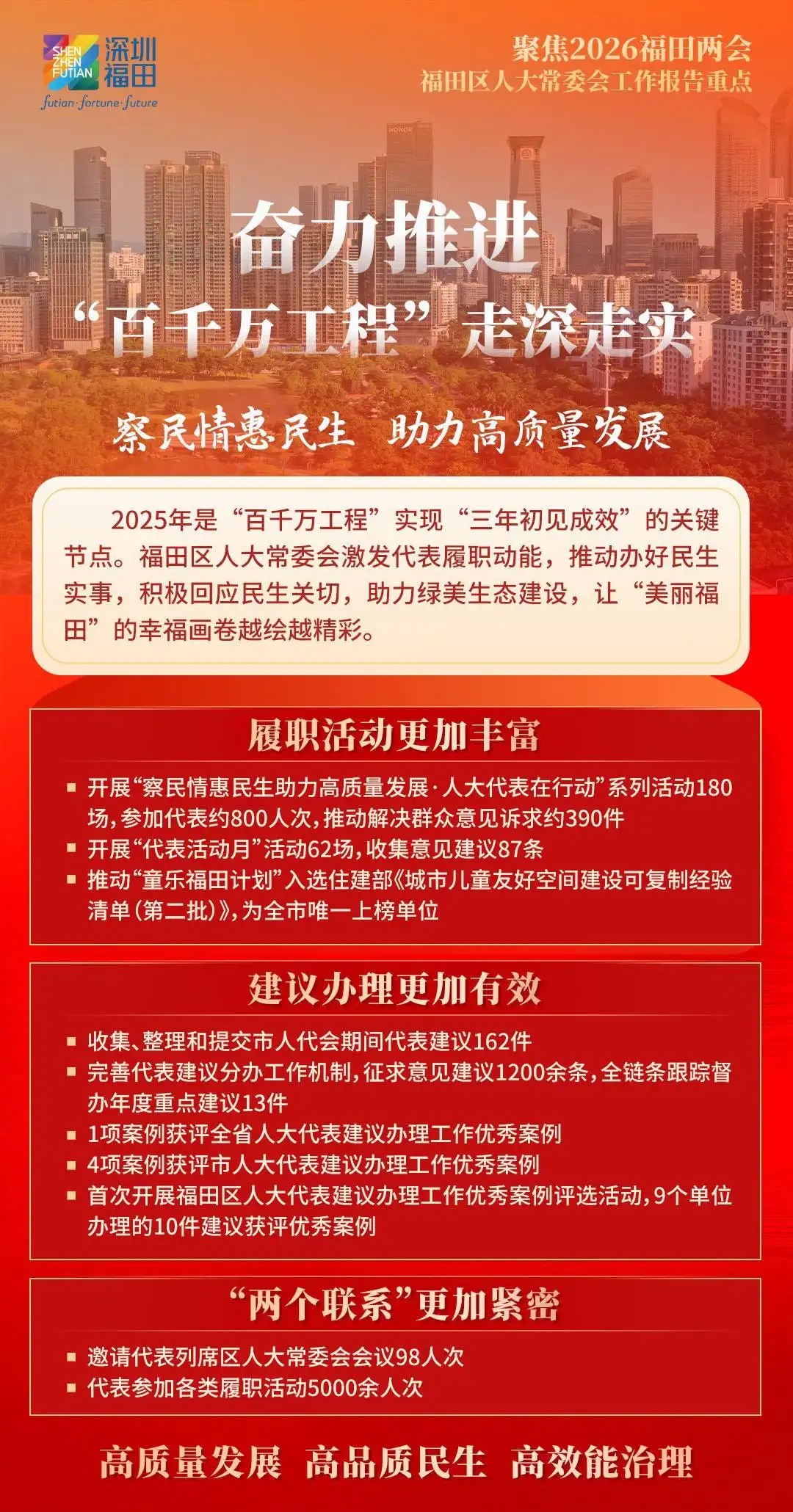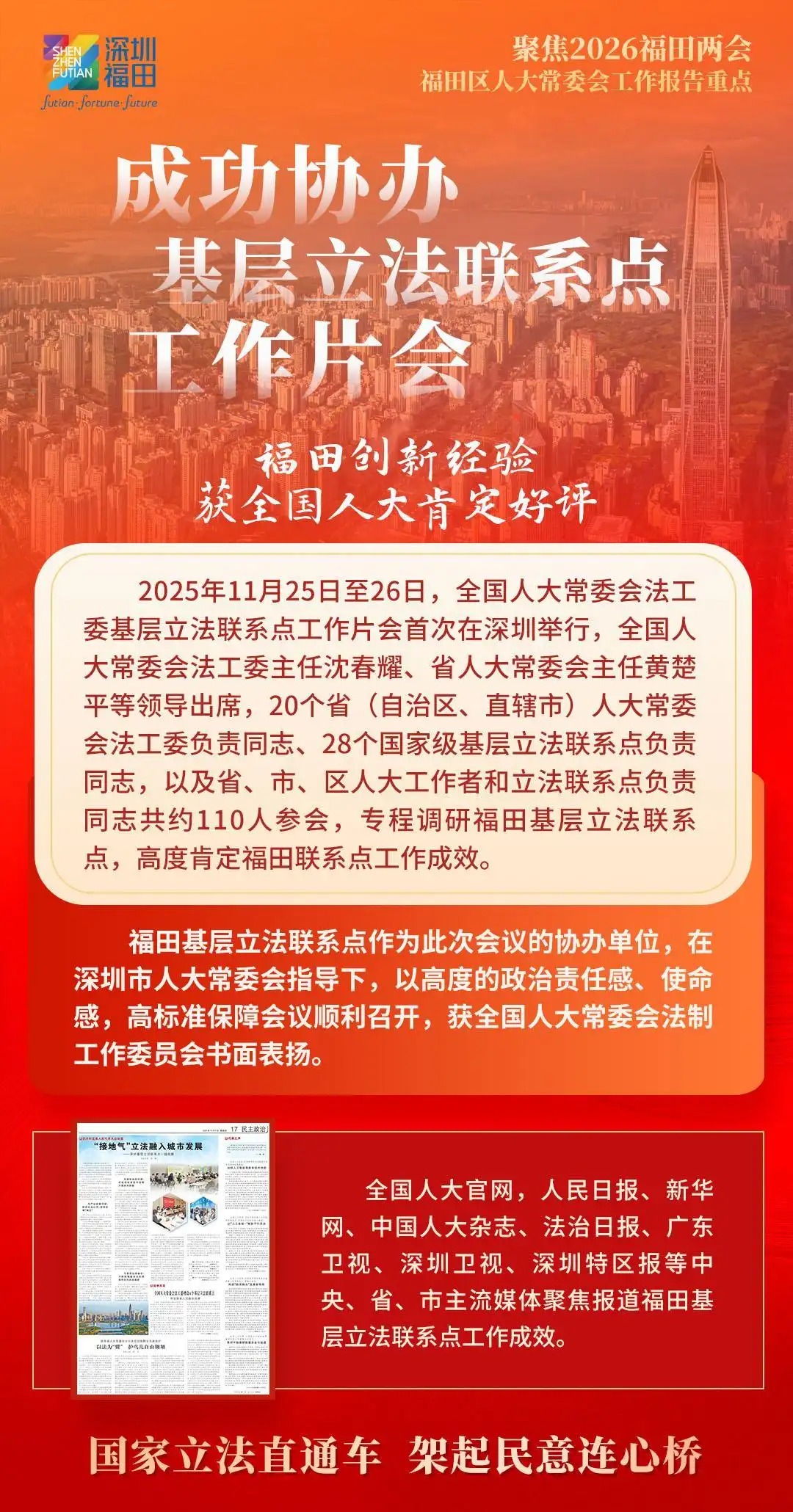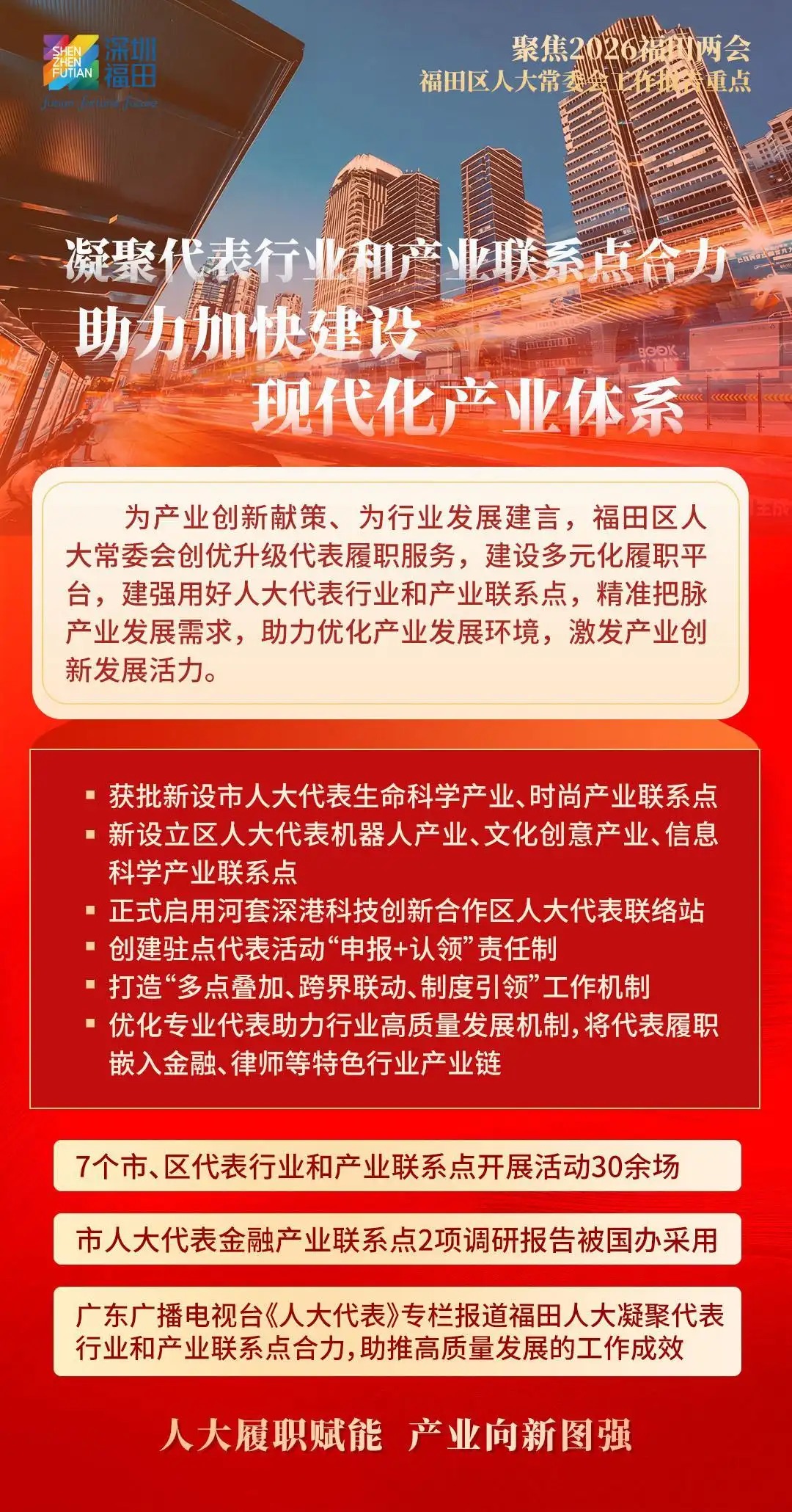 福田区人大常委会将向“新”而行,发挥国家级基层立法联系点作为粤港澳大湾区“立法前哨”的优势作用,积极向上反映民智民意,为福田改革发展争取更多立法和政策支持;向“新”图强,探索行业产业联系点“链”上履职新机制,赋能福田经济社会高质量发展,以奋进姿态走好“十五五”新征程;向“新”聚力,充分发挥人大在密切同人民群众联系中的带头作用,汇集一切资源、力量、智慧,为福田勇担中心城区使命任务厚植民主法治沃土,奋力实现“十五五”良好开局,书写福田“二次创业”新篇章,为深圳加快打造更具全球影响力的经济中心城市和现代化国际大都市作出新的更大贡献。