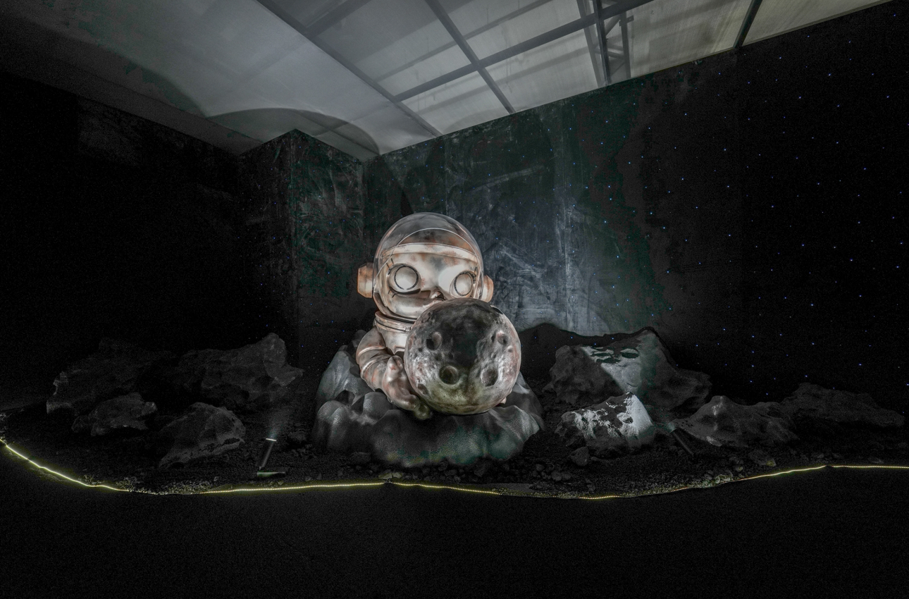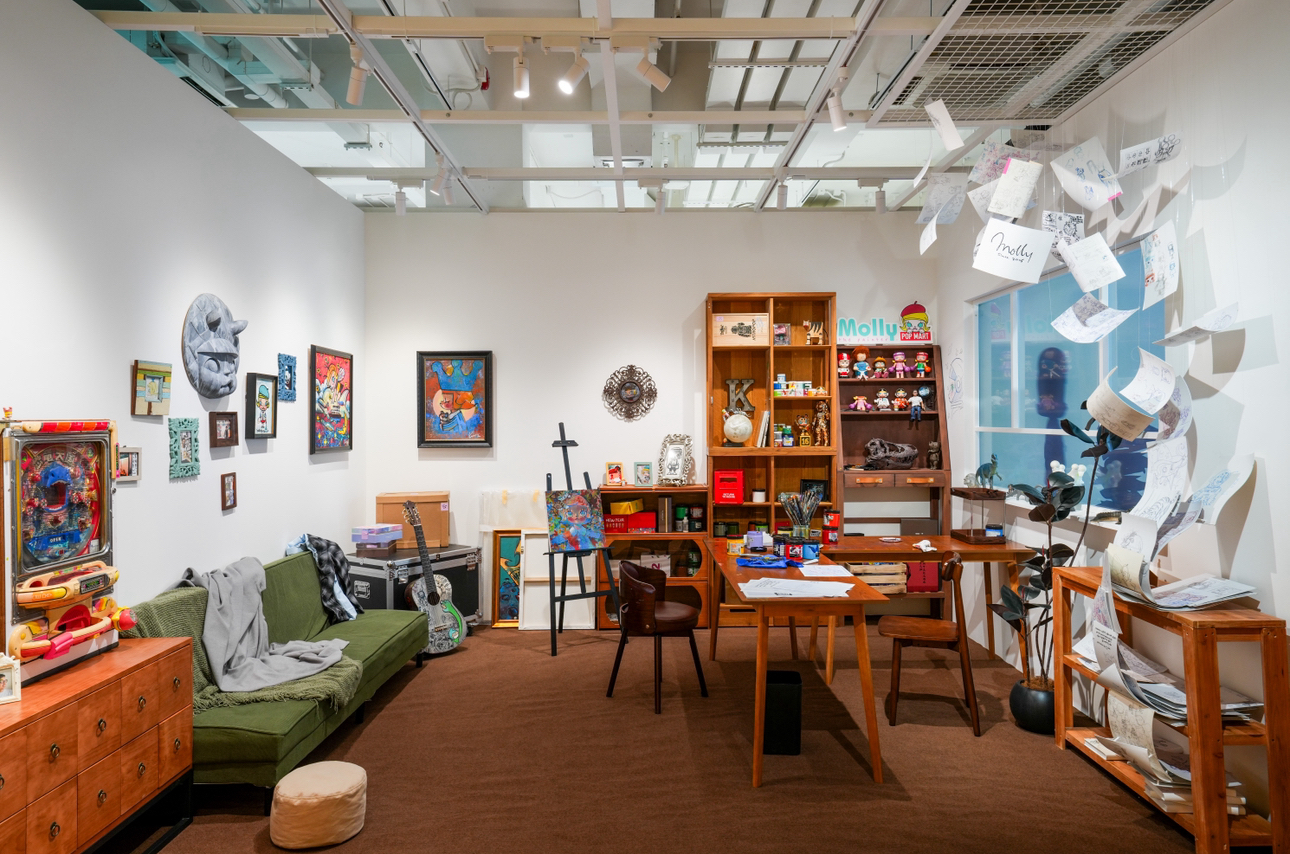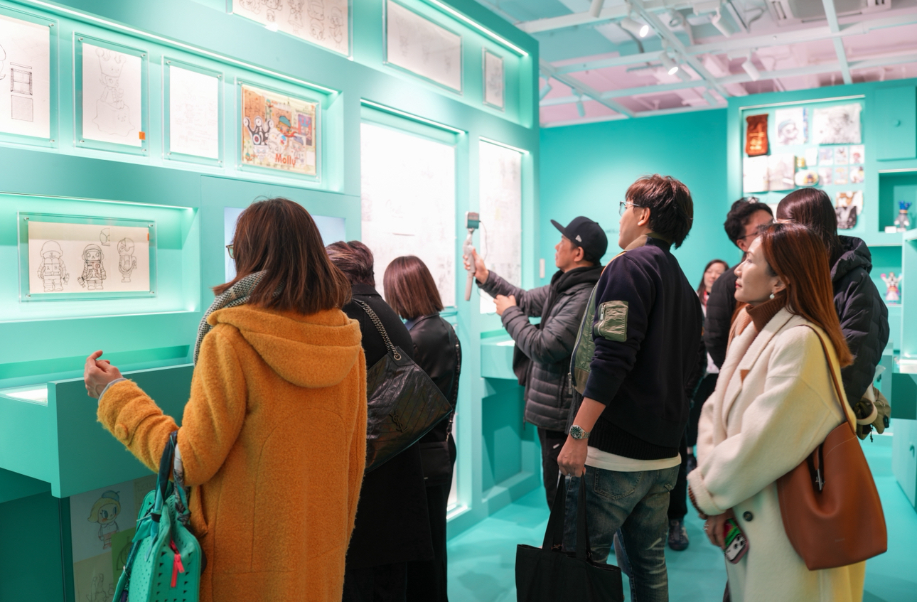 开幕当天,众多粉丝一早便翘首等候,期待与MOLLY共赴一场穿越时光的相遇。特展以五大章节系统梳理了MOLLY的成长轨迹,引领观众踏上一段沉浸式的旅程。“Hi,Molly”讲述了MOLLY诞生之初的故事,在宛如珍奇柜的展厅里,观众跟随第一只“小画家MOLLY”的脚步,回望故事萌芽的起点。“第二回合”高度还原了艺术家工作室场景,生动呈现一个手办从概念到成型的全过程。从草图到半成品,观众能够近距离感受创作过程中反复斟酌和打磨的细节。“绮妙的冒险”以环形展厅集中展示了MOLLY自2016年至今的经典系列手办,并搭建以SPACEMOLLY为主题的视觉空间。步入其中,观众仿佛与MOLLY共赴一场“太空漫游”,在宇宙中无畏探索。