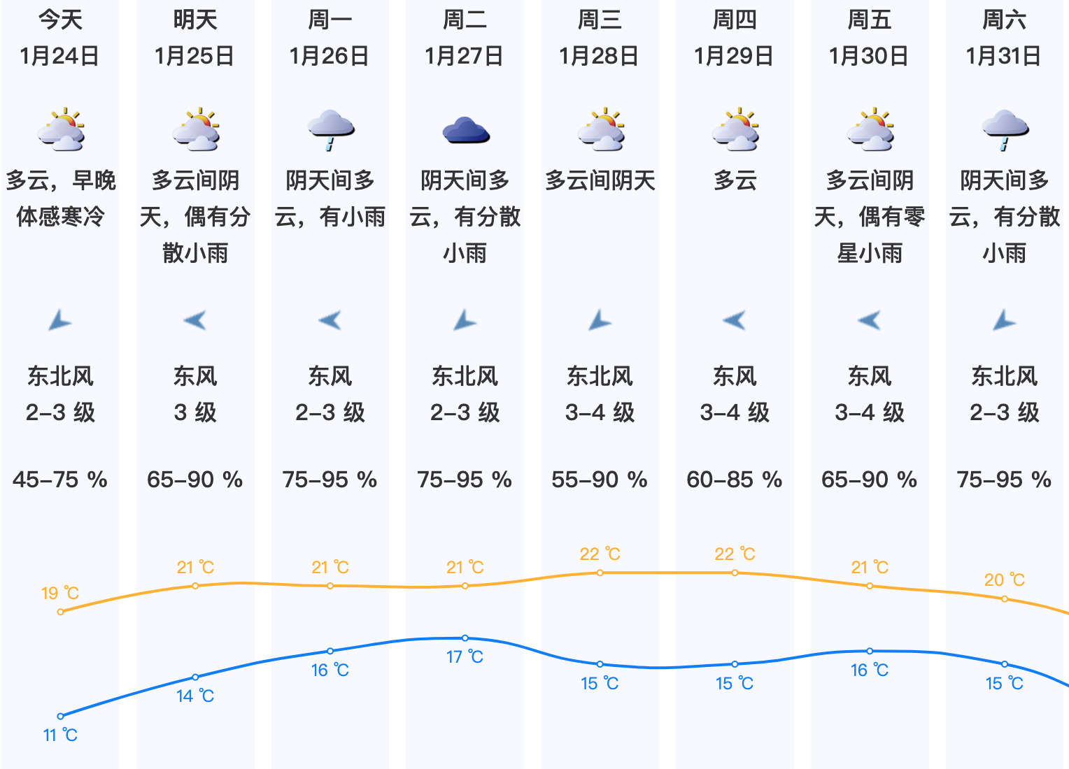 预计24日多云可见阳光,早晨最低气温11℃,白天气温回升至19℃,寒冷天气趋于结束;