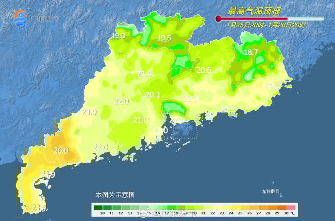 26日,粤西市县多云到阴天,局部有小雨,其余市县阴天间多云,有小雨局部中雨,雨雾天气能见度低。最低气温:韶关及清远的北部市县7~10℃,粤西、珠江三角洲中南部、粤东市县14~17℃,雷州半岛17~20℃,其余市县10~14℃。