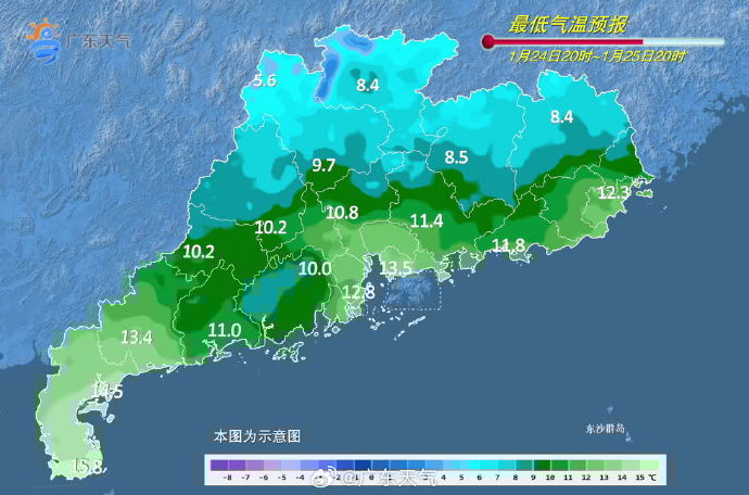 24日,珠江三角洲南部和粤东市县晴到多云,夜间转阴天,有分散性零星小雨,其余市县多云间晴天。大部市县早晚有轻雾,局部地区有雾。最低气温:粤北偏北市县2~5℃,局部有霜冻,粤北偏南市县、珠江三角洲北部和东部市县、粤东的北部市县5~8℃,雷州半岛市县12~16℃,其余市县8~12℃。