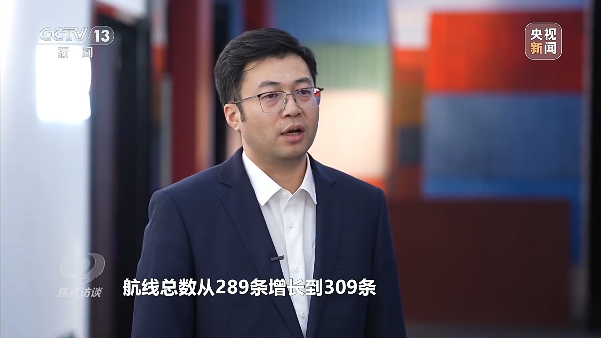宁波舟山港股份有限公司业务部副部长 冷智强:航线在港口越多,代表着这个港口的舱位量越大,能给外贸企业提供更多的海运舱位。以宁波舟山港为例,从2021年开始到2025年年末,航线总数从289条增长到309条,增加了20条航线。