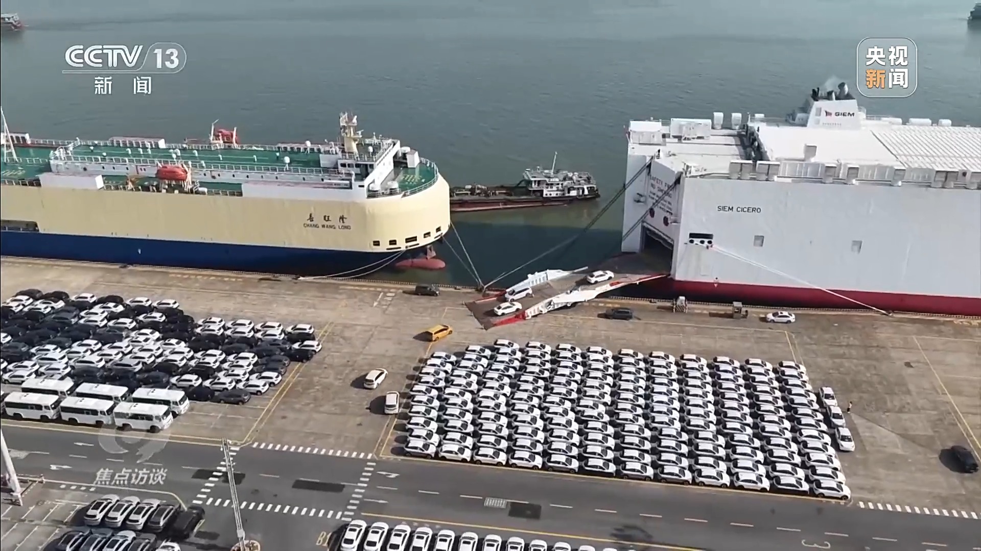 除了服务外贸的“硬支撑”在不断升级,“软环境”同样也在持续优化。广州港南沙汽车码头,一艘巨大的滚装船正在紧张作业。一辆辆驶向甲板的正是当前中国出口的“明星产品”——新能源汽车。