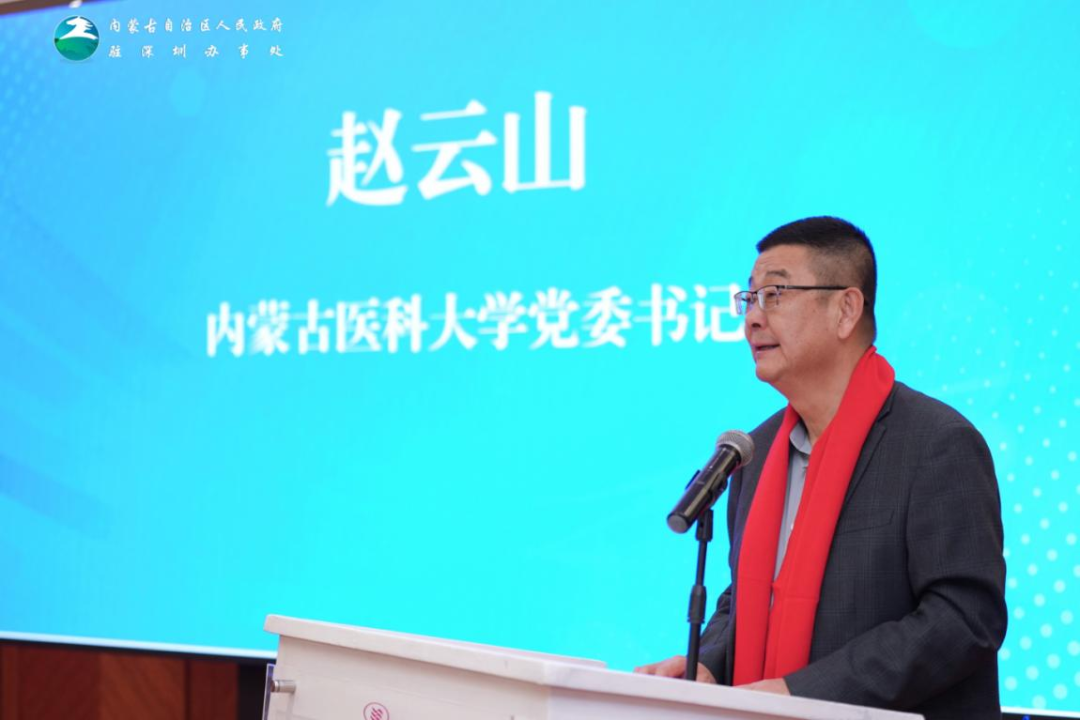 内蒙古医科大学党委书记赵云山在讲话中,全面介绍了学校的发展概况与核心成果。学校拥有金山、新华等4个校区,构建了覆盖本科、硕士、博士的多层次医学教育体系,以及中医学(蒙医)博士后科研流动站等多个国家级、自治区级学科与科研平台。他强调,校友是母校最宝贵的财富,更是校地合作的重要纽带,期盼在粤校友发挥专业与资源优势,以人才培养交流、技术协作与学科建设、产业与公共卫生合作等方式深化蒙粤校地协同合作,推动优质医疗资源均衡布局,共同促进家乡医疗事业发展。