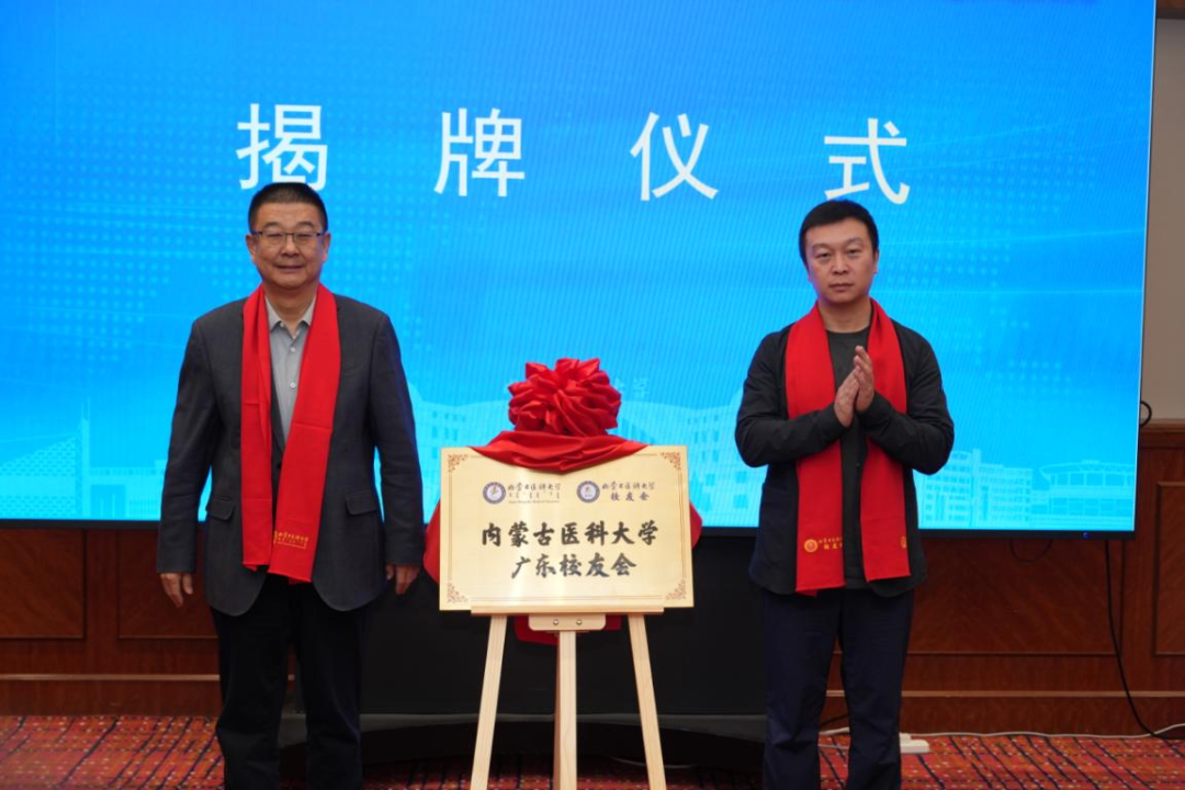 内蒙古医科大学党委书记赵云山、内蒙古自治区人民政府驻深圳办事处党组书记、主任梁峰为内蒙古医科大学广东校友会揭牌。赵云山书记勉励校友会当好连接母校与大湾区的“连心桥”、服务家乡医疗发展的“智囊团”,携手打造“校地协同、校友联动、开放创新、共赢发展”的典范。