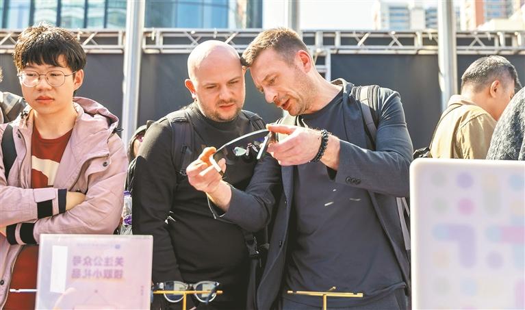 外国客商拿着AI眼镜仔细研究。