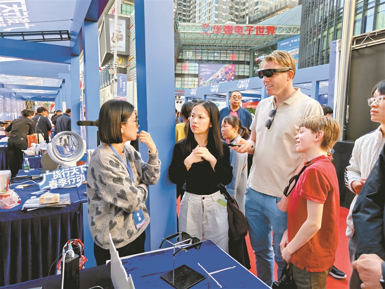 记者昨天走访华强北多个专业市场看到,在“广货行天下”春季行动消费电子专场促销活动的带动下,华强北步行街人潮涌动,无论专业市场还是沿街商户皆门庭若市,体验、咨询的消费者往来不绝。数据显示,专场活动当天,华强北街区整体客流较平日新增约10万人次、同比增长15%。
