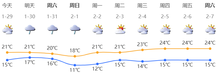 深圳今日多云转阴天;气温15-21℃;东风2-3级,沿海、高地和海区最大阵风6-7级;相对湿度45%-90% 。