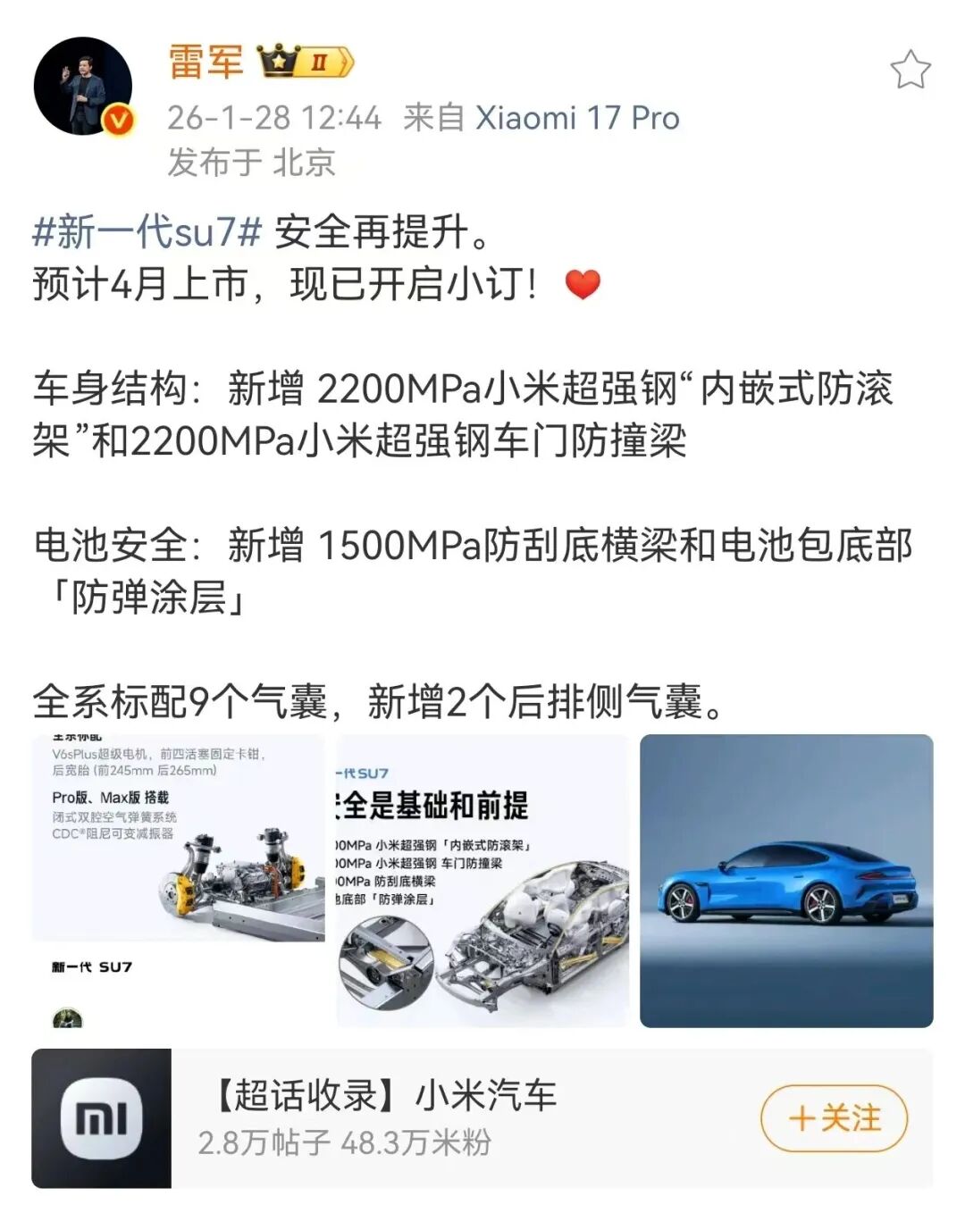 ● 1月28日,雷军发文:新一代su7安全再提升,预计4月上市,现已开启小订。