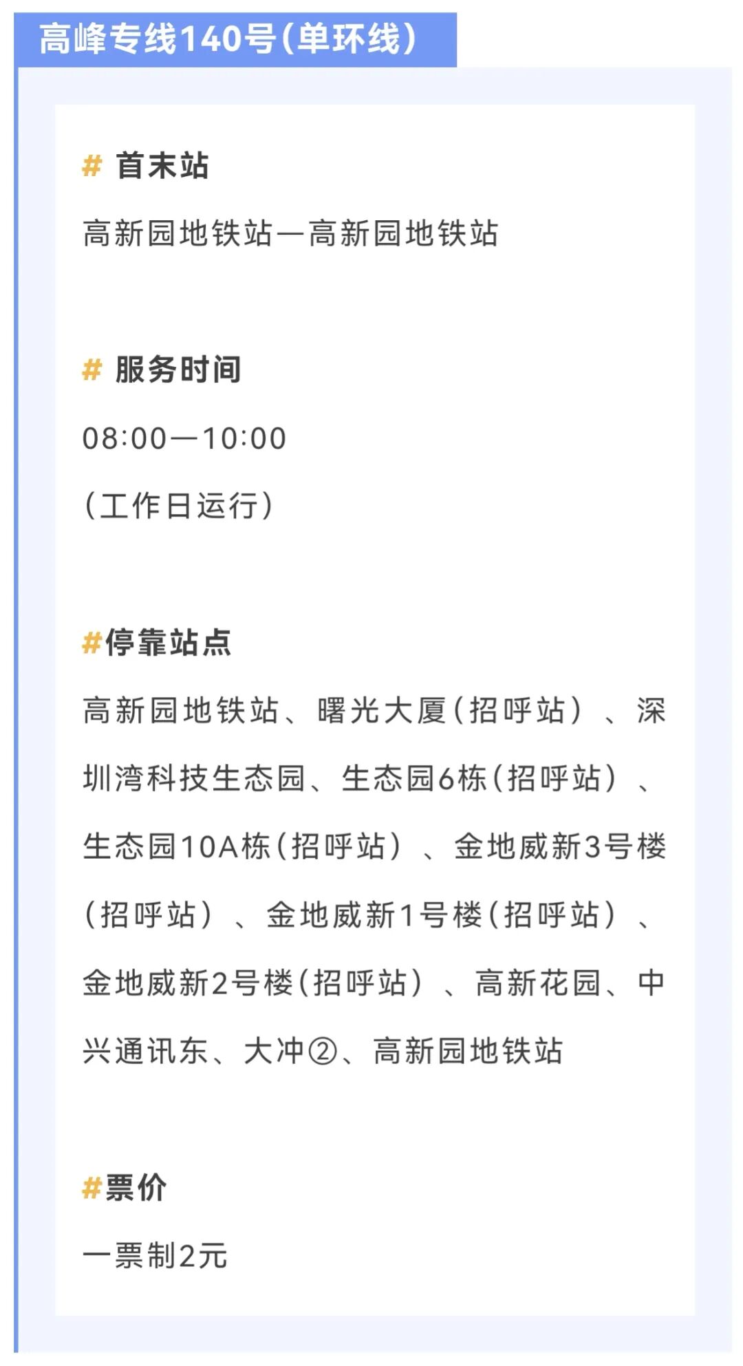 ● 1月29日起,深圳交通高峰专线140号试运行,途经高新园地铁站。