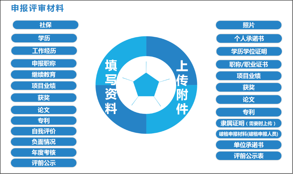 按照系统提示如实填写申报资料,并上传个人照片、承诺书、相关证书证明、业绩成果、学术成果(论文著作)等申报材料扫描件。上传材料要求详见各评委会通知要求。