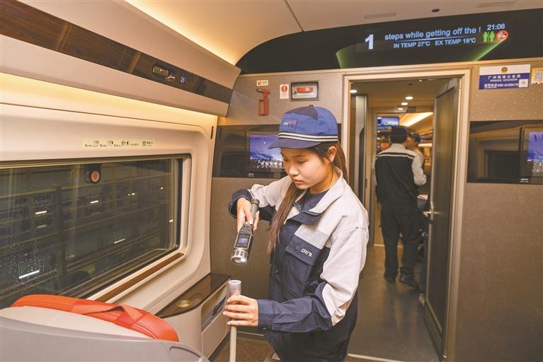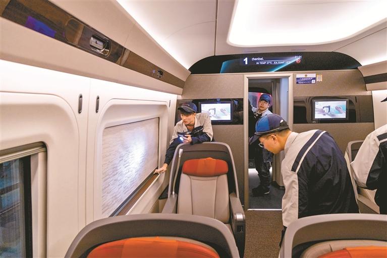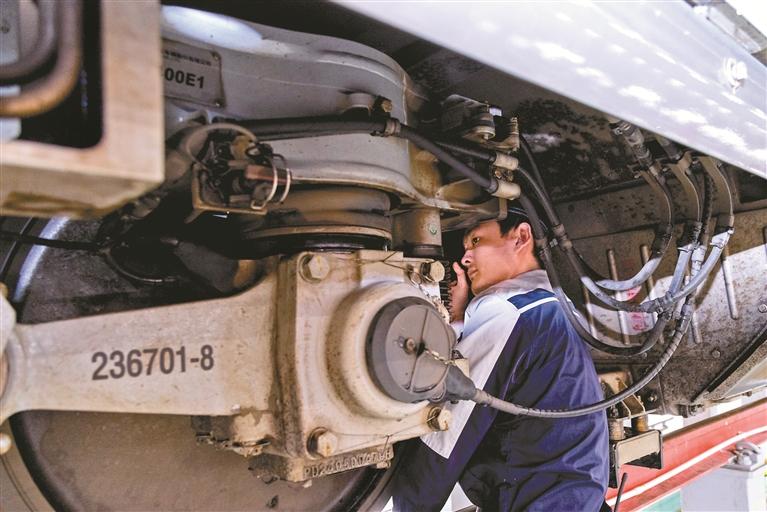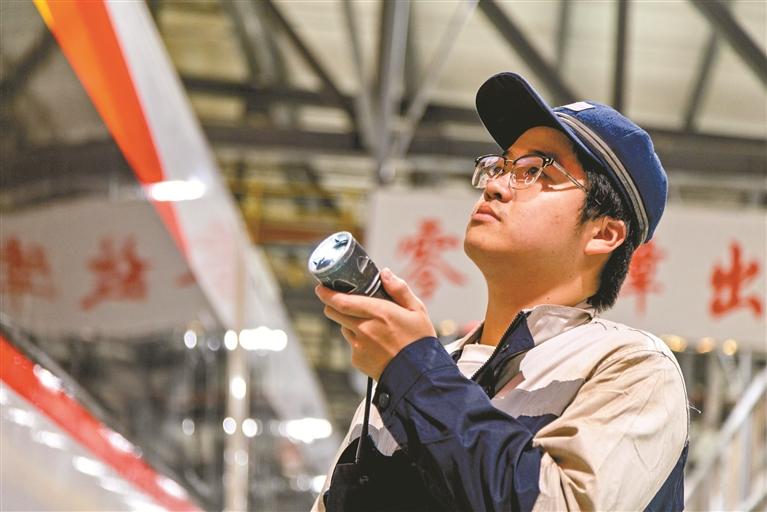 20时许,检修作业全面铺开。一列列完成运输任务的动车组有序驶入检修库。机械师们迅速进入岗位:容琪昌与同事在车旁立岗接车,他借助手电筒细细“扫描”车体,对车辆外观进行检查。列车停稳并确认安全后,贺婧灵与同事一起进入车厢内,按照既定流程,逐一测试座椅、照明等设施。车外,何满意同步对动车走行部转向架、制动单元等关键部位进行检查。每晚,他们平均需检修4至4.5列8编组动车,每组列车须在3小时内完成系统“体检”——从车底走行部、车内服务设施到车顶受电弓,每一环节均需严格把关。