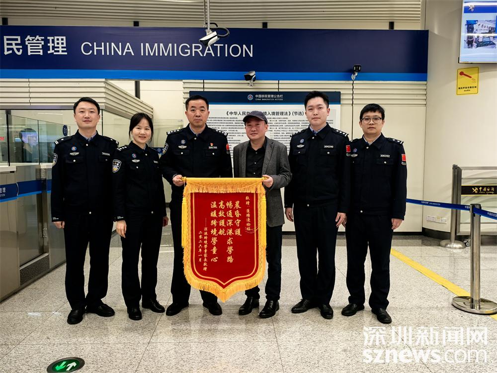 深圳新闻网2026年2月3日讯(记者 蔡雄彬)近日,深圳市民刘先生手持一面锦旗,专程来到莲塘边检站,向长期以来为跨境学童提供周到服务的移民管理警察表达诚挚谢意。锦旗上“晨昏守护畅通深港求学路;高效护航温暖跨境学童心”的字样,不仅凝结着刘先生一家的感激,更折射出深港两地众多跨境学童家庭对莲塘边检站保障跨境学童通关服务的认可。