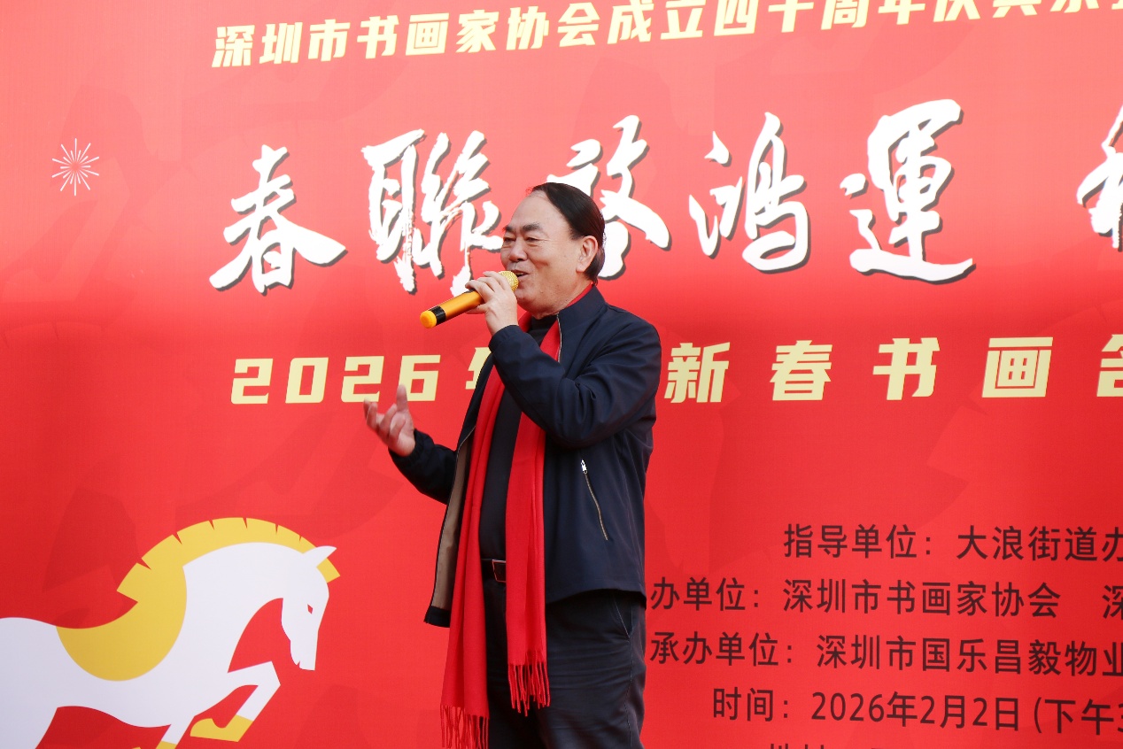 下午三时,送福活动在科技园6栋西侧正式拉开帷幕。深圳市书画家协会主席唐大进登台致辞。他饱含深情地说:“四十年风雨兼程,我们以书画为桥,连接传统与现代;今天我们以春联为礼,把最真挚的祝福送到大家手中。”他的话语点燃了现场的热烈气氛,台下响起阵阵掌声。