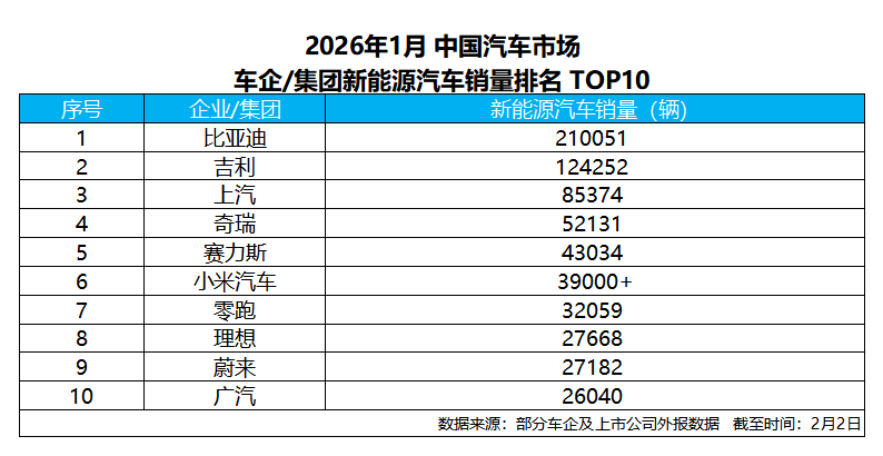 深圳新闻网2026年2月4日讯(记者 叶梅)新年伊始,中国新能源汽车市场的竞争轮廓迅速显现,头部车企之间的差距在1月销量榜单中被进一步拉开。截至2月2日,根据部分车企及上市公司对外披露的数据,比亚迪以超21万辆的新能源汽车销量位居行业首位,展现出强大的市场竞争力,继续稳居中国新能源市场头部位置,并在主要车企中拉开明显差距。