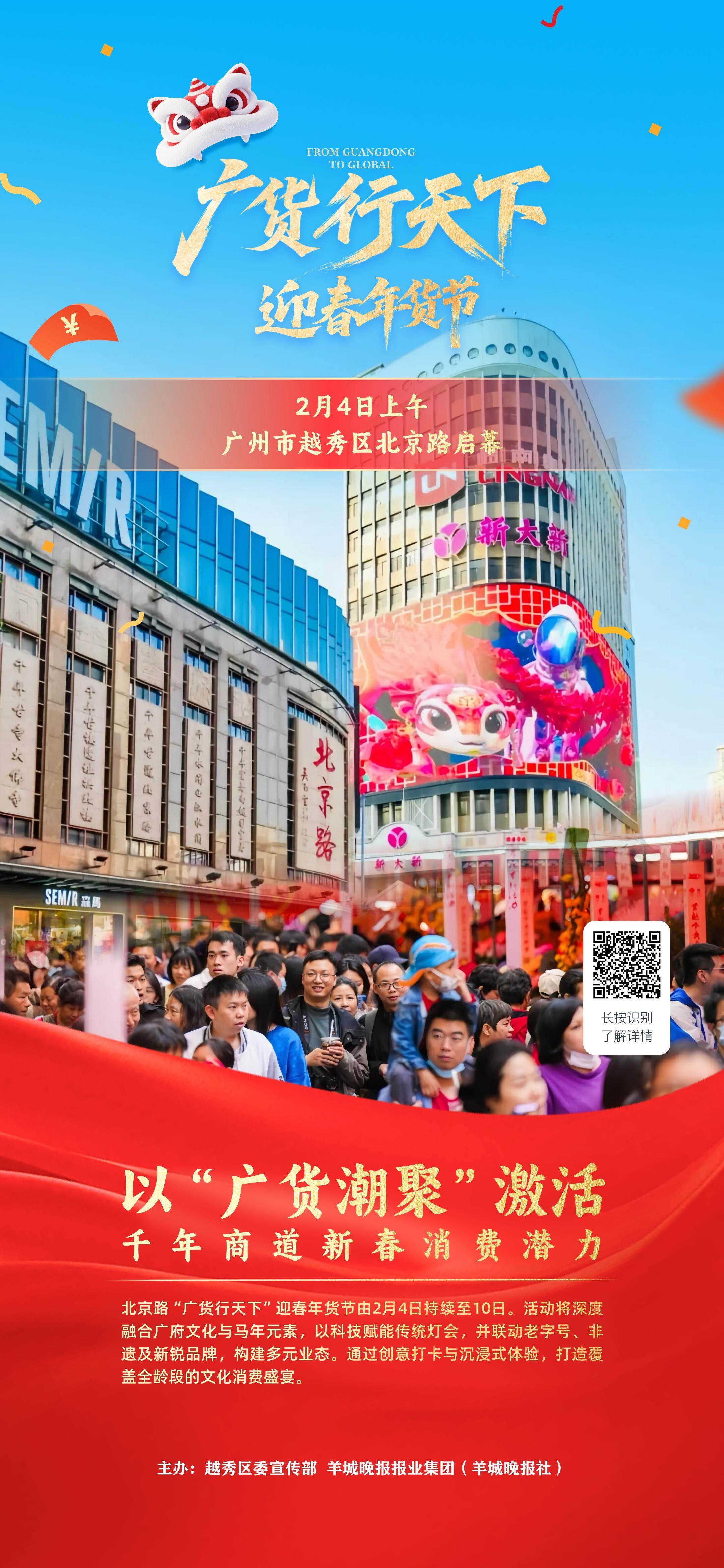 本次活动由中共广州市越秀区委宣传部、羊城晚报报业集团指导,广州北京路文化核心区管理委员会与羊城晚报数媒公司联合主办,旨在以“广货潮聚”激活传统商街新春消费潜力,共同擦亮“广货行天下”春季行动的金字招牌,推动“广货行天下”迎春年货节向IP化、品牌化发展,携手让广货在千年商道的烟火气中风行四方。