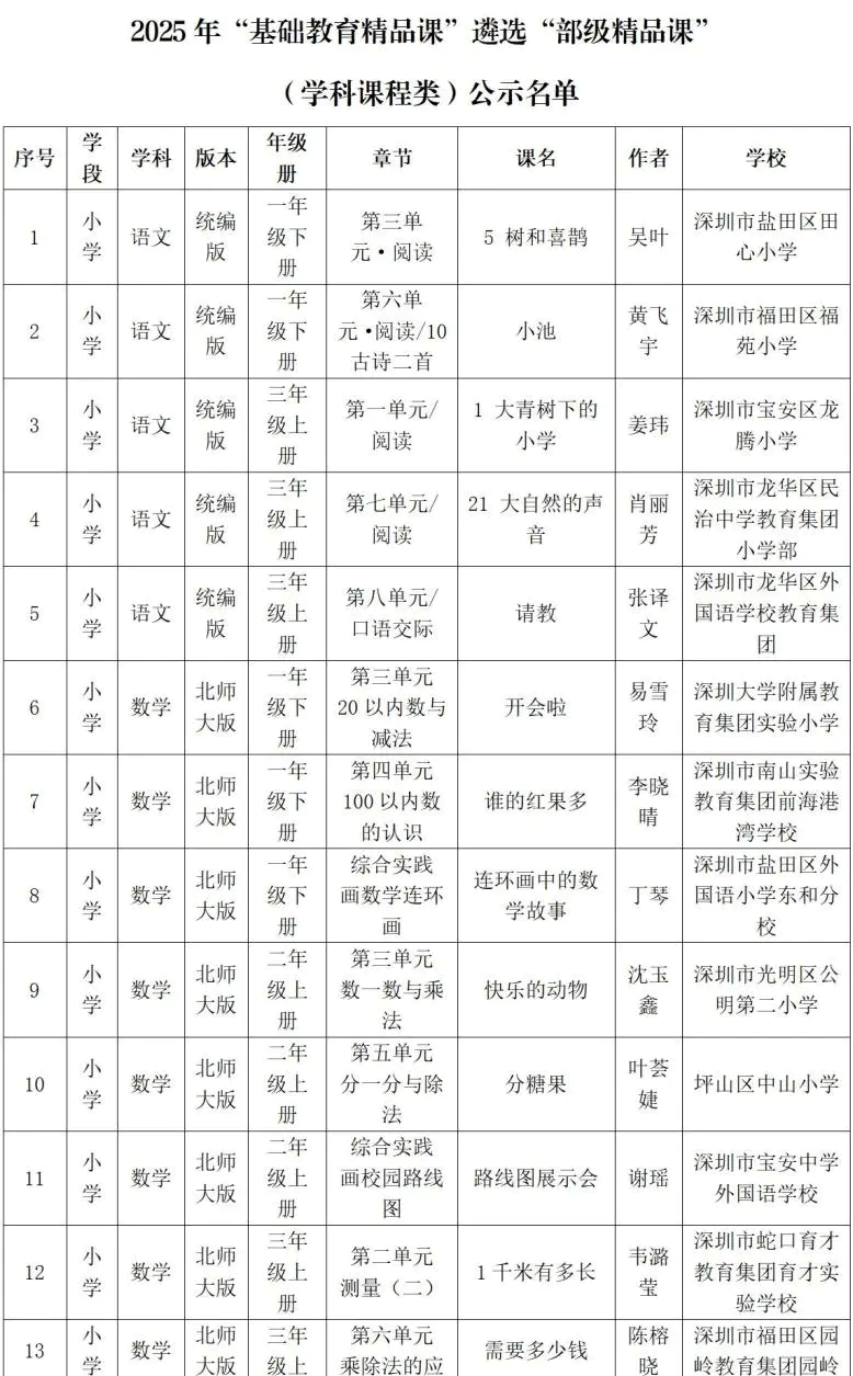 深圳新闻网2026年2月4日讯(深圳特区报记者 姚卓文)近日,教育部发布《关于2025年“基础教育精品课”遴选“部级精品课”名单的公示》,经教育部组织专家遴选,初步确定了2025年“基础教育精品课”部级精品课名单。记者从深圳市教育科学研究院获悉,在此次评审中,广东省共有248节课拟被评为部级精品课,其中深圳表现亮眼,共有103节课例入选。