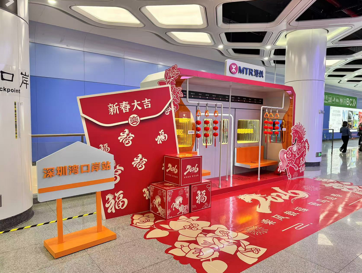 为增添春节氛围,港铁(深圳)在口岸及枢纽车站布置了新春主题装饰,并特别开设“春节惊喜列车”,融入传统节庆元素,让市民乘客在出行中感受到浓厚的年味与温情。