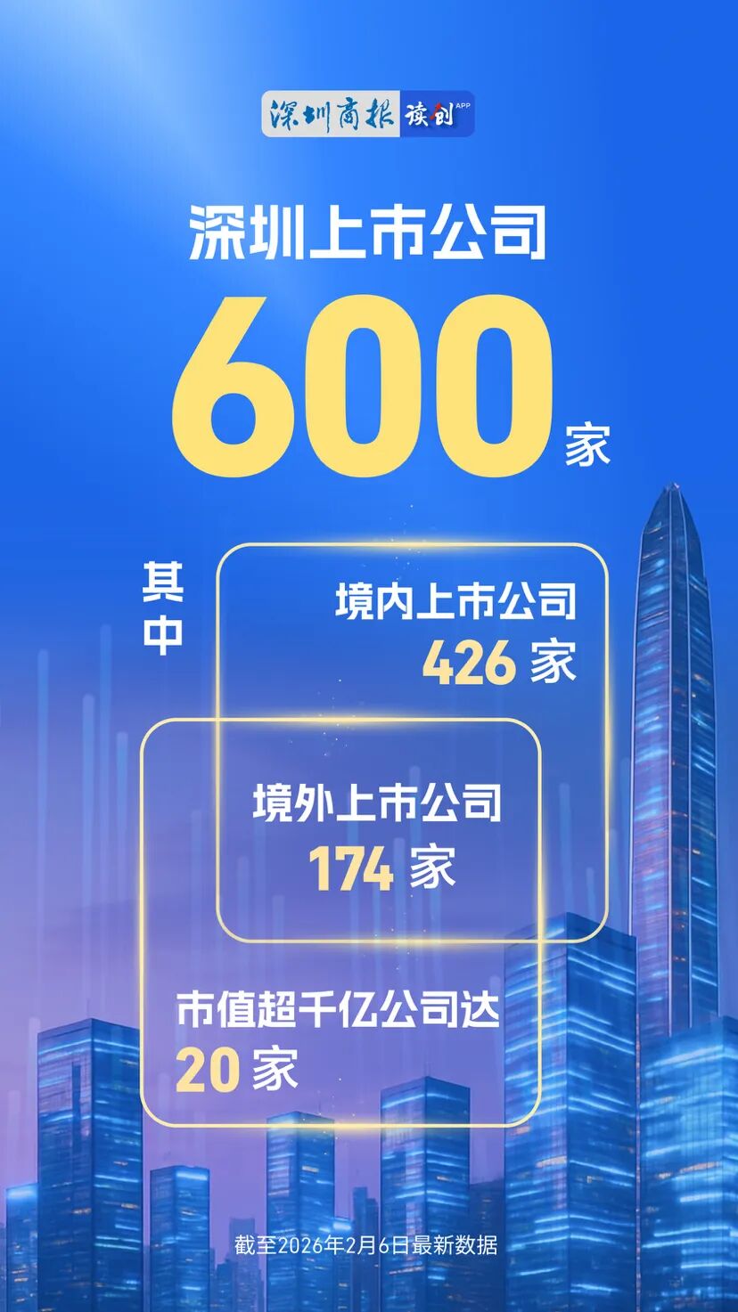深圳新闻网2026年2月6日讯(深圳商报记者 谢惠茜)2月6日上午,随着卓正医疗、大族数控在港股敲钟上市,宣告深圳迎来了里程碑时刻:全市上市公司总量突破600家大关,其中,境内上市公司426家,境外上市公司174家。