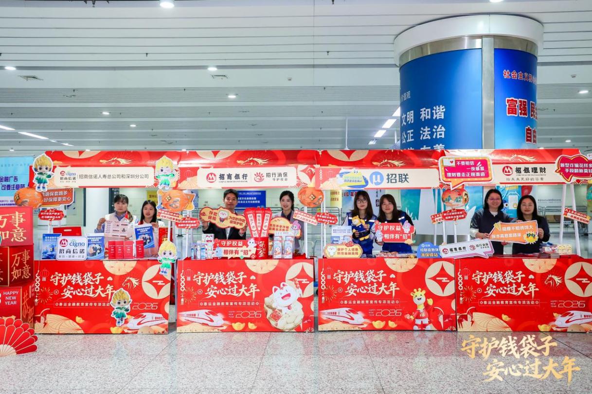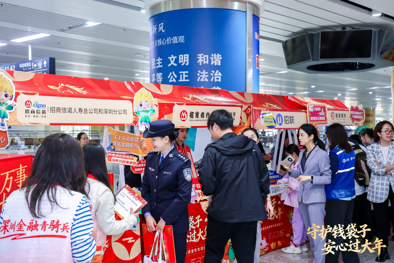 在深圳市银行业保险业消费者权益保护促进会的指导下,多家金融机构将严肃的金融知识普及,巧妙融入年味十足的市集氛围中,为南来北往的旅客送上一份特别的“平安礼”。招商银行及子公司协同联动、凝心聚力,以专业举措和强大合力共同筑牢春运金融安全屏障,为过往旅客平安出行保驾护航。