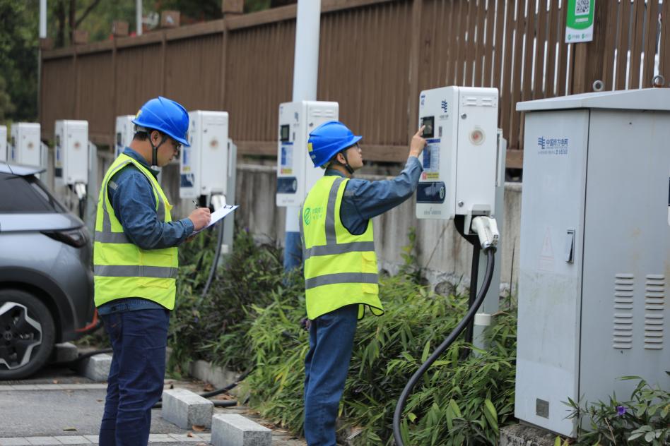 在宝安簕杜鹃公园充电站,南方电网深圳充电运维团队正在开展充电桩巡视作业。(杨双源 摄)