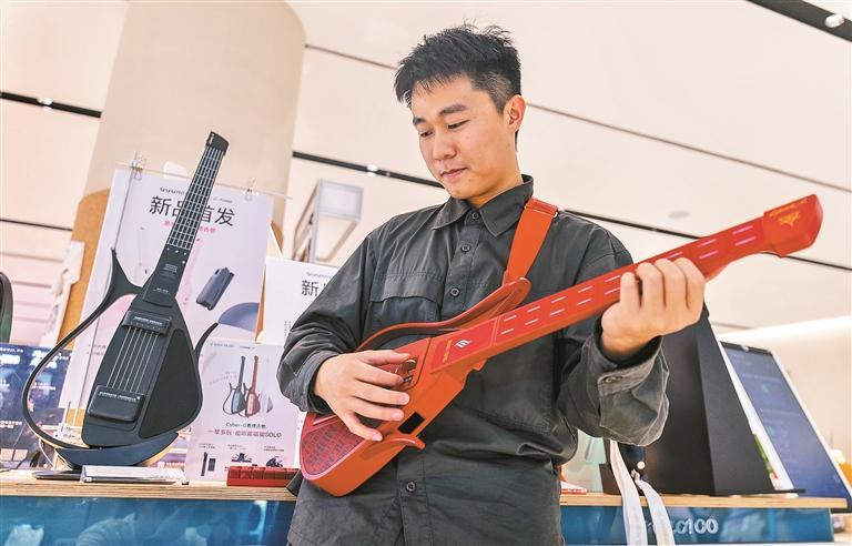 市民在INNO100全球创新旗舰店体验赛博吉他。