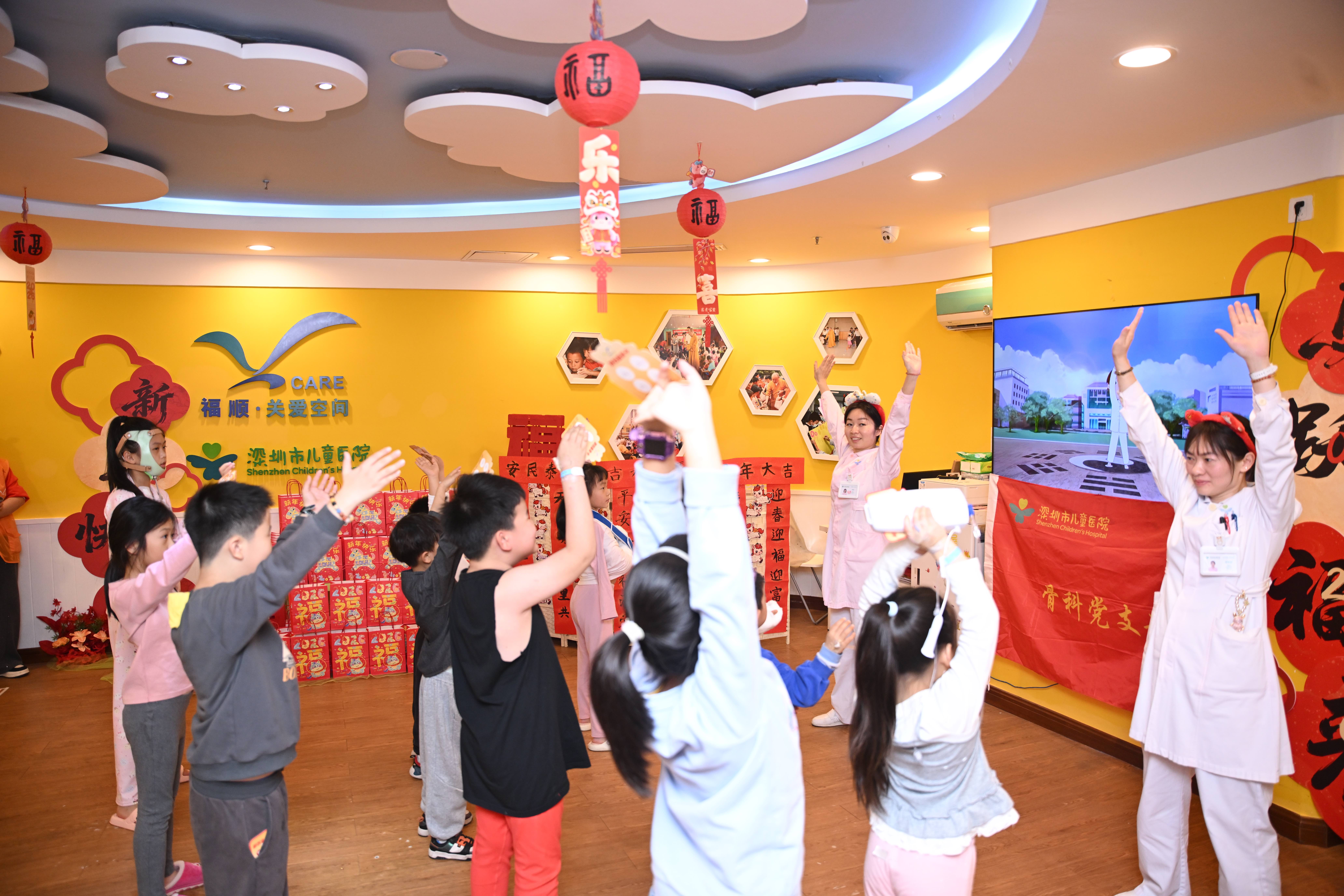 深圳新闻网2026年2月9日讯(记者 张小臣)2月7日下午,由深圳市关爱办、深圳市儿童医院主办的“福启新岁,‘童’享安康”新春品牌活动在深圳市儿童医院福田院区及龙华院区共11个Vcare关爱空间温馨举办。活动融合新春寓意、人文关怀、心理支持与健康理念,通过精心设计的互动游戏与温暖的陪伴,为879名患儿及医护人员送去了新春的祝福,打造了一场“温暖疗愈之旅”。