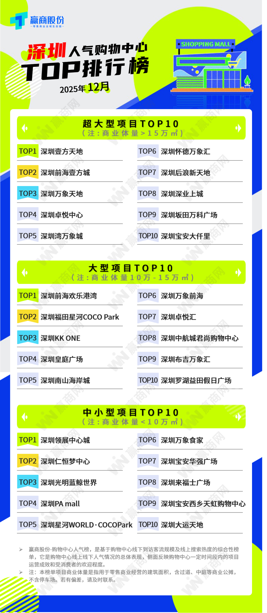 商圈活力和吸引力稳步提升,优质商业供给持续扩容。2025年,全市商业载体建设保持高质量发展态势,标杆项目“顶流”效应凸显,为消费增长提供了坚实空间。深圳湾万象城二期、深圳大悦城、前海冰雪世界等一批重磅商业地标在年内相继开业,引爆消费热潮。K11 ECOAST、深业上城等项目通过“商圈+生态”模式,成功打造商文旅消费新热点。深圳壹方天地稳居全市人气榜首,跻身全国十大热门商圈,彰显了深圳商业的强大吸引力。一批具有市场号召力的新商业项目开业,不仅丰富了市民的消费选择,更通过业态与场景创新,持续增强了对粤港澳大湾区乃至全国消费者的吸引力。例如:深圳大悦城开业首日,42万人次的客流量与近2000万元的销售额,不仅是商业的成功,更是观察中国经济活力与城市竞争的一个鲜活切片;罗湖益田假日广场的试运营首月,客流突破200万人次,销售额突破百万的门店达到20家。“十四五”期间,全市新增商业综合体95个,总面积超过670万平方米。其中,10万平方米以上的商业综合体19个,5万平方米以上的商业综合体51个。2025年全市新开业商业综合体约23个,总面积超过173.61万平方米。