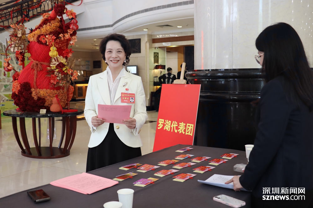 2月8日上午,深圳市人大代表闵齐双在罗湖代表团报到现场领取今年两会相关资料和证件。(张玲 摄)