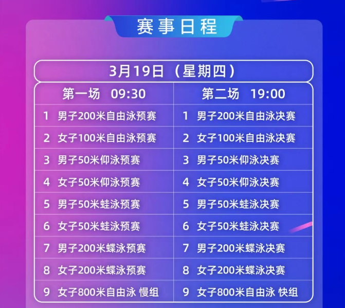 这场泳坛盛会将于3月19日至22日在深圳市龙岗区深圳大运中心游泳馆举行,四天赛程里,每日都设置了09:30和19:00两场比赛,预赛与决赛在同一天进行,赛程紧凑且精彩密集,市民能沉浸式感受泳池边的金牌争夺战。