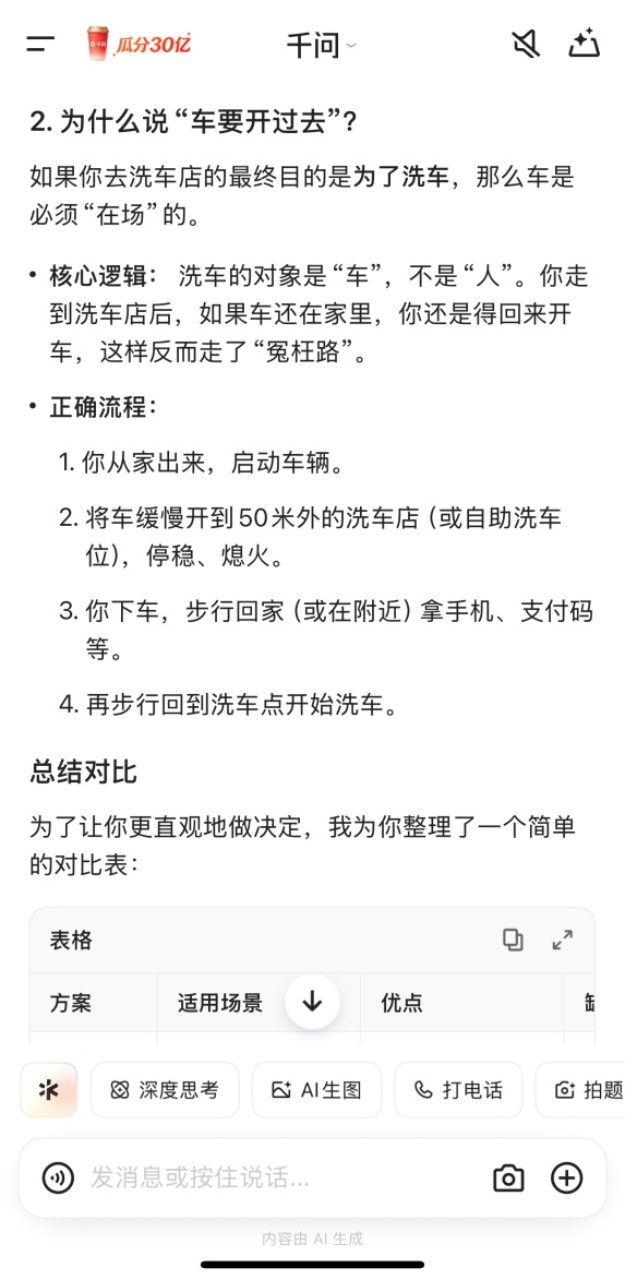 千问则给出“人走过去,车开过去”的建议,但针对性地就不同需求场景提出方案。例如其所指的“人走过去”是建议本人去洗车店咨询、预约等情况。