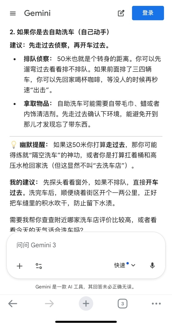 Gemini3则幽默提出解决办法取决于“洗车‘姿势’”,并调侃说“如果这50米你打算走过去,那你可能得练就‘隔空洗车’的神功,或者你是打算扛着桶和高压水枪回家洗”。