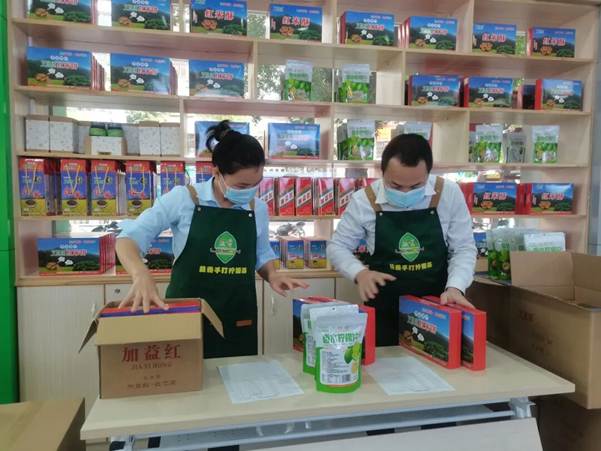 图为工作人员正在打包农产品准备发快递