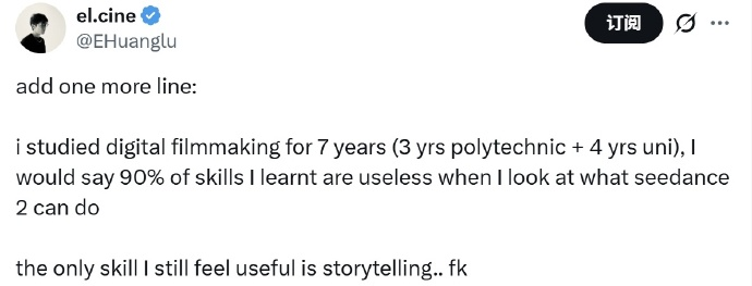 ▲国际顶尖创作者“el.cine”感慨:我可以说,当我看到Seedance 2能做什么时,我学到的90%技能都是无用的。