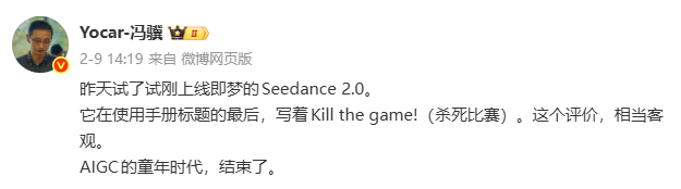 Seedance 2.0的爆火并非偶然。游戏科学CEO冯骥在试用后评论,这标志着“AIGC的童年时代结束”。