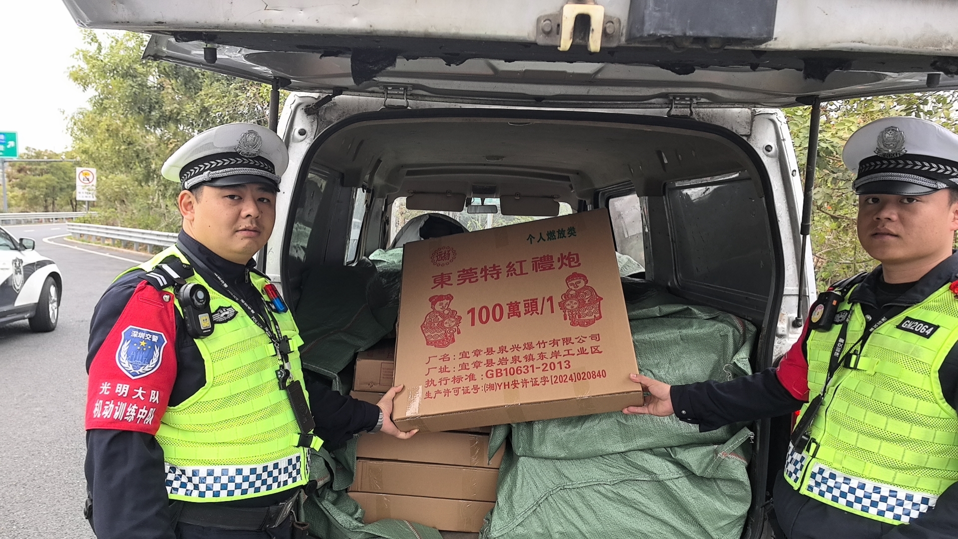 行动期间,执勤警力对过往的其中一辆车牌号小型厢式货车进行例行检查时,发现该车行驶轨迹异常、车厢密封严实,存在明显安全隐患。经依法开箱查验,车内装载大量烟花爆竹成品,共计30余箱(件)。经现场初步核查,该车驾驶员无法提供《烟花爆竹道路运输许可证》及危险货物运输相关资质,涉嫌非法运输危险物质。执法人员当场依法扣押涉案车辆及全部烟花爆竹,并将涉案人员及车辆移交玉塘派出所作进一步调查处理。目前,玉塘街道应急办已介入,案件正在依法侦办中。